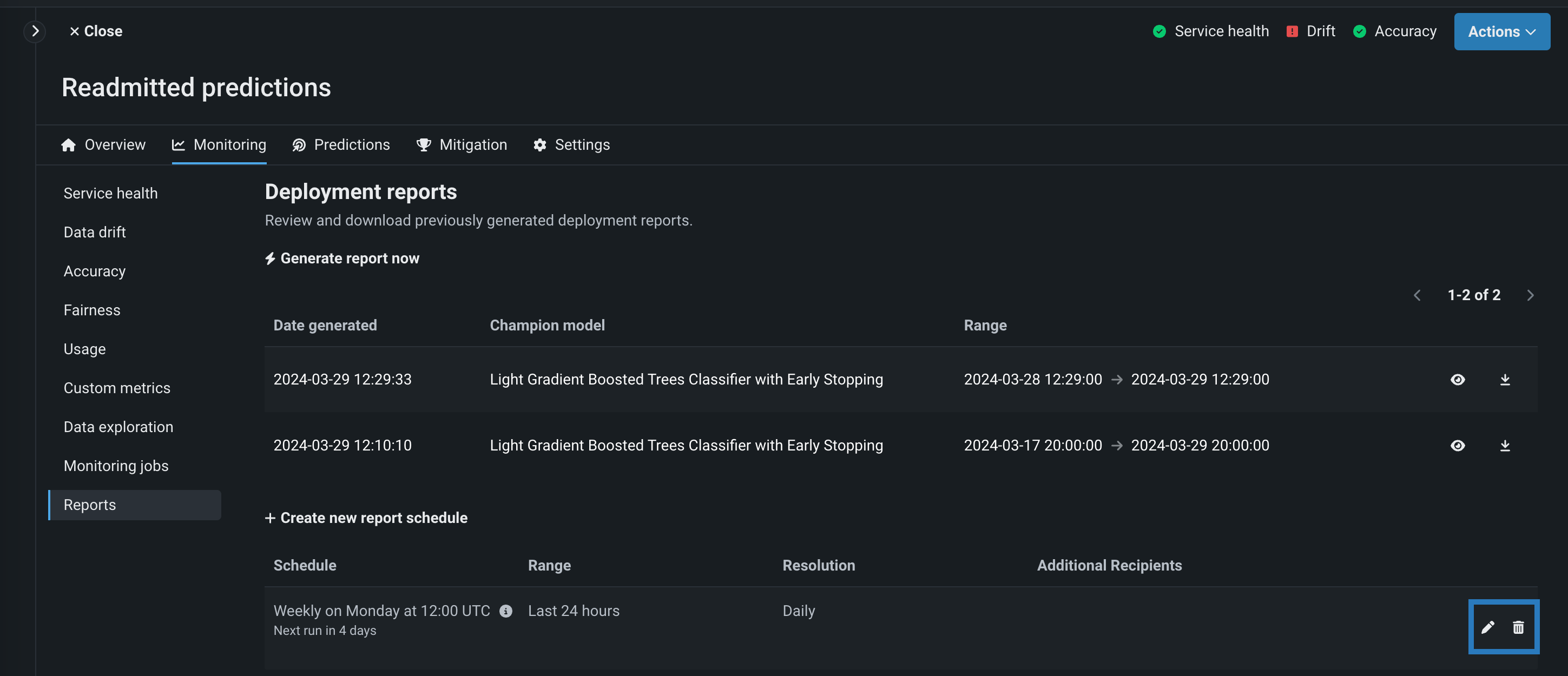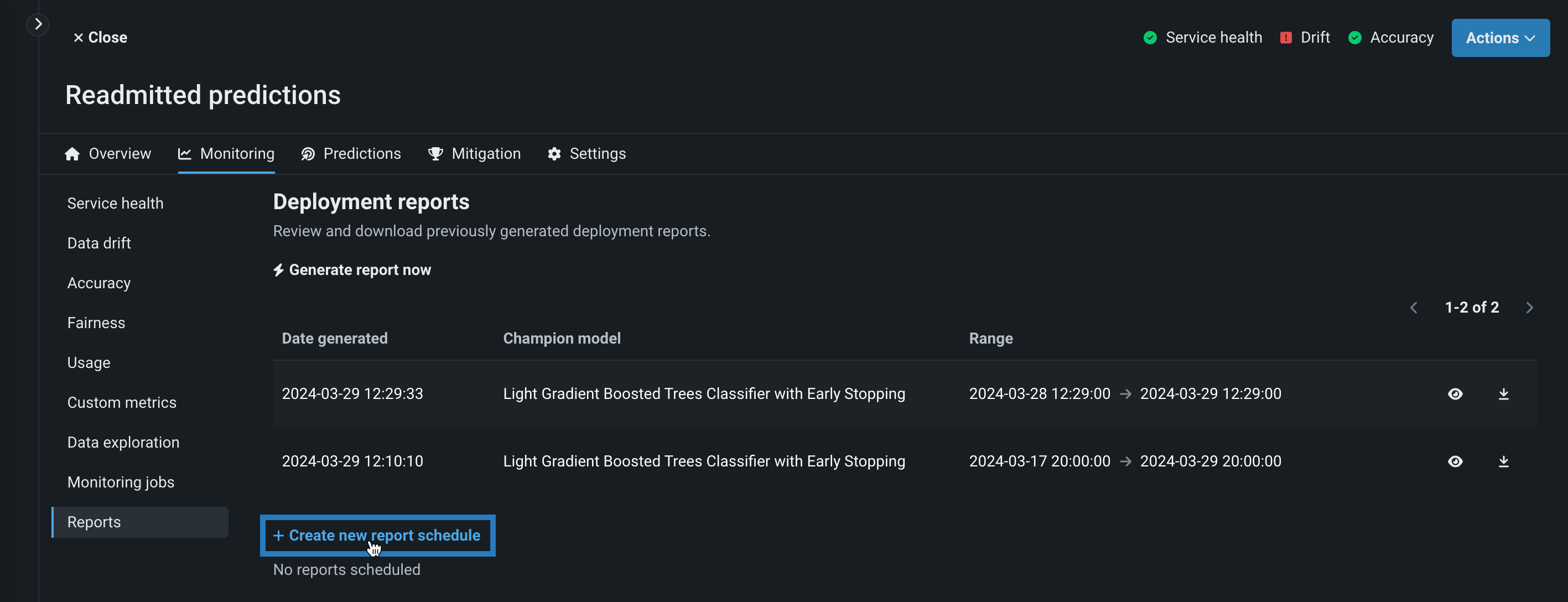 DataRobotを使用すると、手動で作成するだけでなく、スケジュールを管理してデプロイレポートを自動的に生成できます。 デプロイのレポート生成をスケジュールするには、デプロイインベントリからデプロイを選択し、モニタリング > レポートタブに移動します。 デプロイレポートページで、+ 新しいレポートスケジュールを作成するをクリックします。