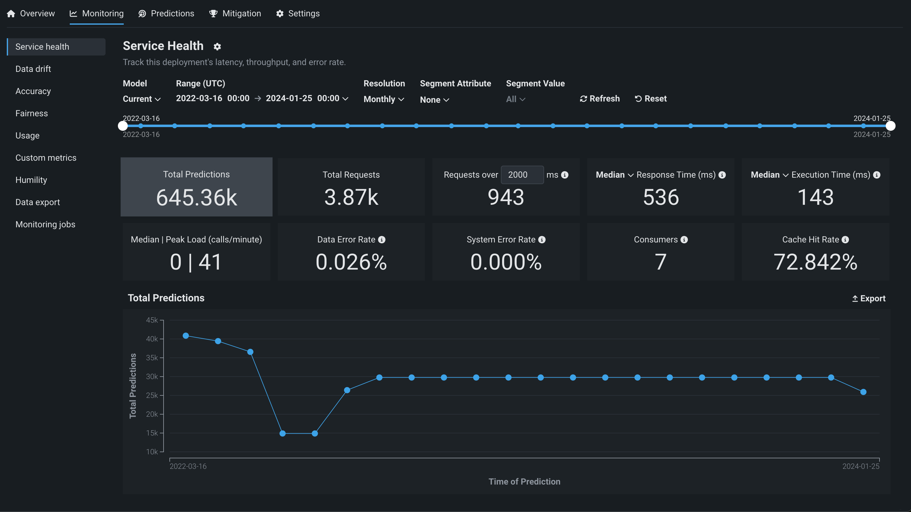 データドリフトタブと精度タブについてデフォルトで、「予測リクエストの時間」は、予測リクエストを送信した時刻になります。これは、 予測履歴とサービスの正常性設定で、予測タイムスタンプでオーバーライドできます。