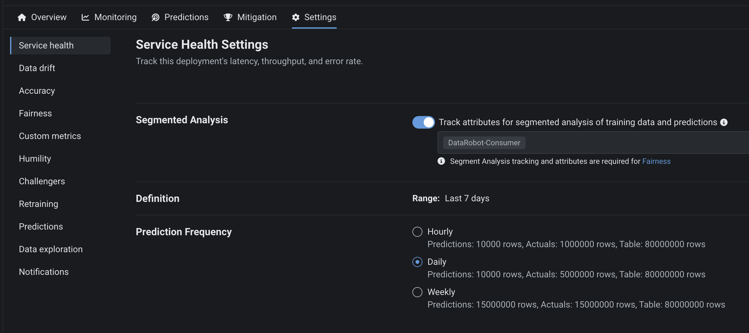 合計タイルには、設定済みの間隔制限(タイルの下部に表示)で相対的に処理された予測値と実測値が表示されます。 さらに、返される予測結果のテーブルサイズ制限を表示できます。 テーブルサイズは、デプロイ用にDataRobotのデータベースに保存される予測行の数を制限します。 DataRobotは、予測ごとに1つの行(二値分類デプロイの場合は2つの行)を保存します。 多クラスデプロイの場合、すべてのクラスの情報は1つの行に保存されます。 時間間隔の制限(毎時、毎日、毎週)を変更しても、テーブルの制限は変更されません。 テーブル制限を超えるリクエストは、時間に関係なく拒否されます。
