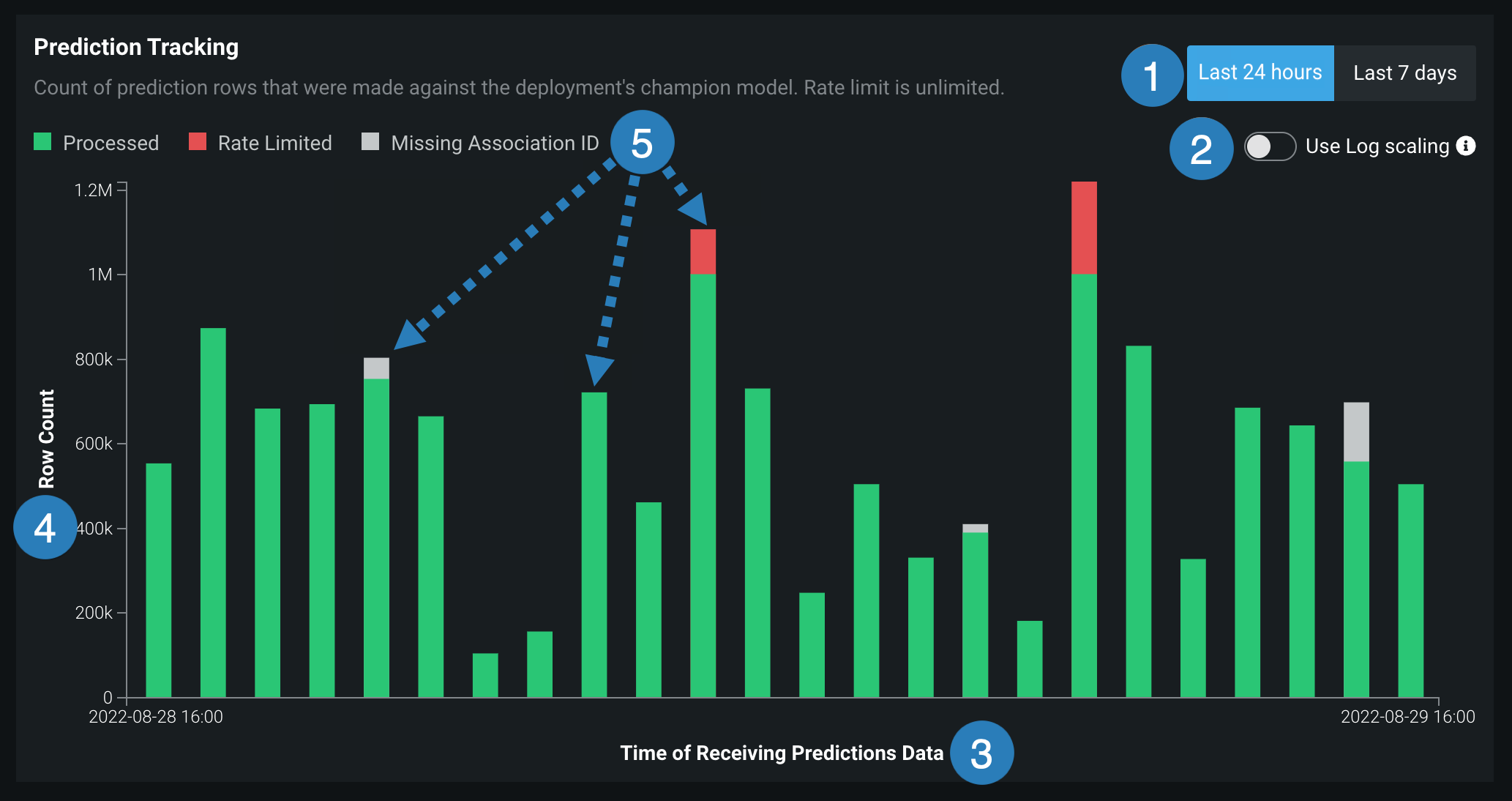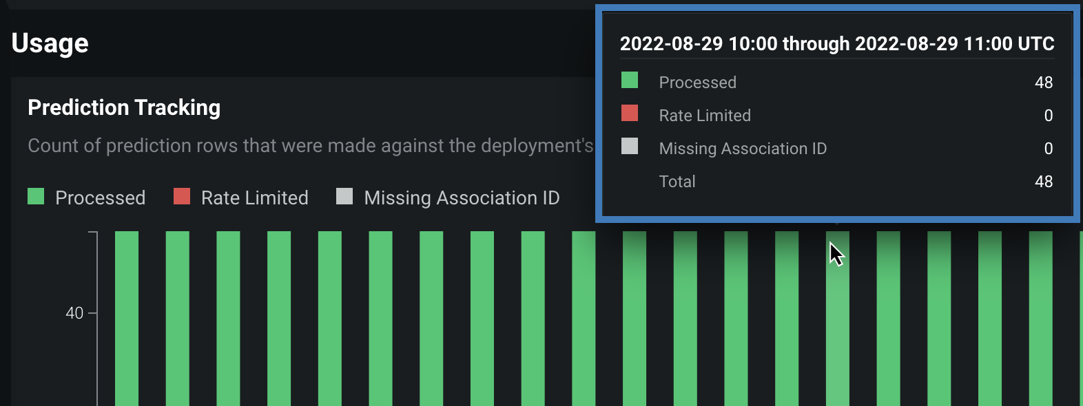 モニタリング > 使用状況タブの左側に、予測追跡チャートが表示されます。これは、過去24時間または7日間の予測処理状況を示す棒グラフであり、処理済みの予測行、関連付けIDがない予測行、およびレート制限された予測行の数を追跡します。 選択したビュー(24時間または7日間)に応じて、ヒストグラムのビンは1時間または1日単位になります。