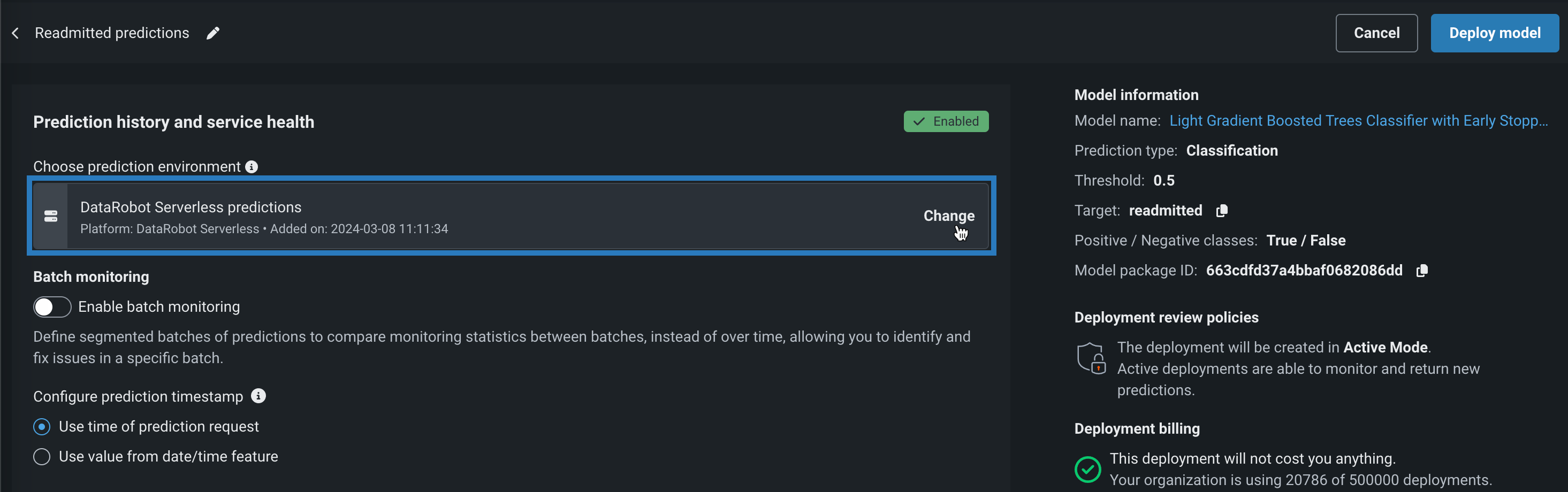 DataRobotが管理設定を有効にすると、この予測環境が管理エージェントを介して、DataRobotカスタムモデルとスコアリングコードモデルを自動的にパッケージ化してデプロイできます。