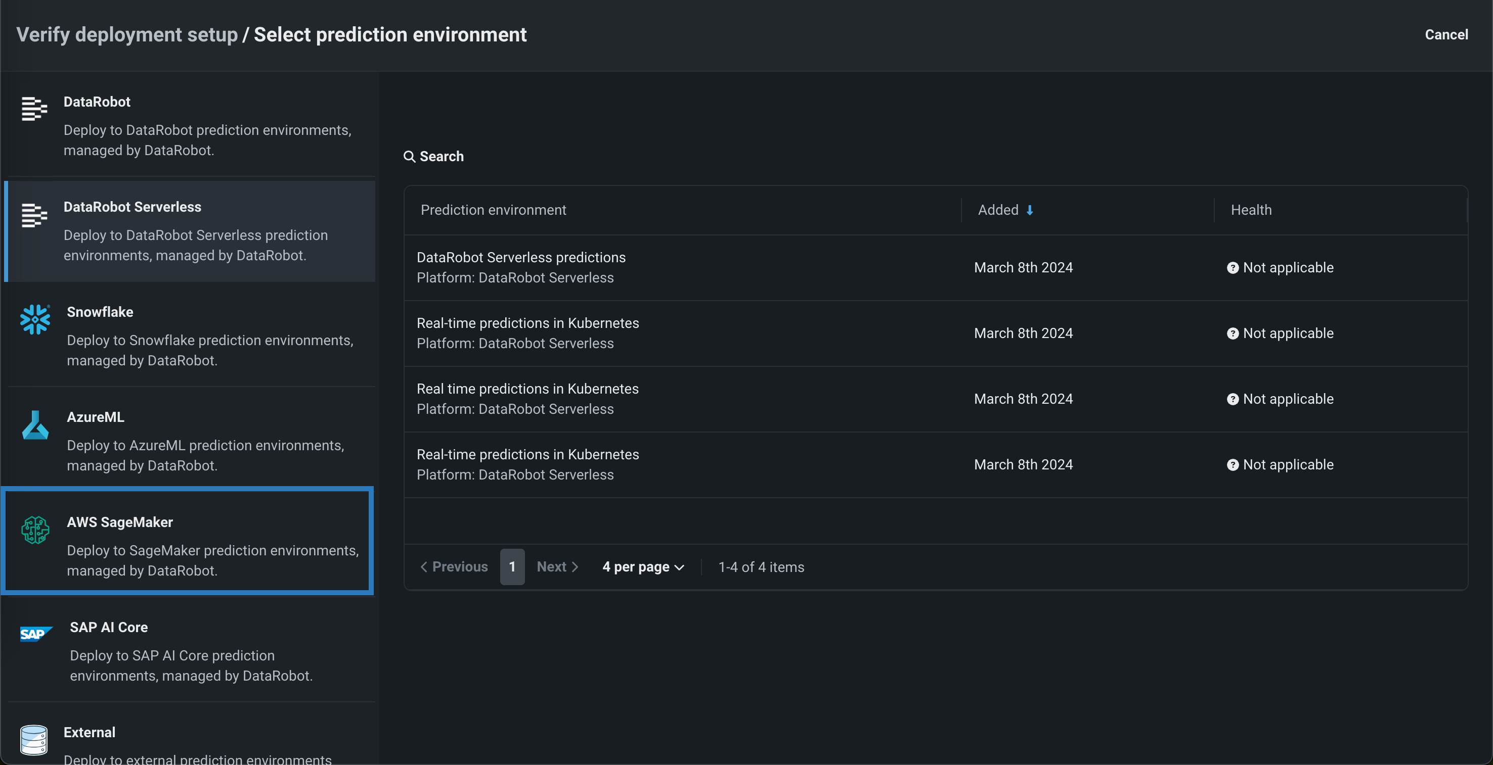予測環境の選択パネルで、AWS Sagemakerをクリックしてから、デプロイする予測環境をクリックします。