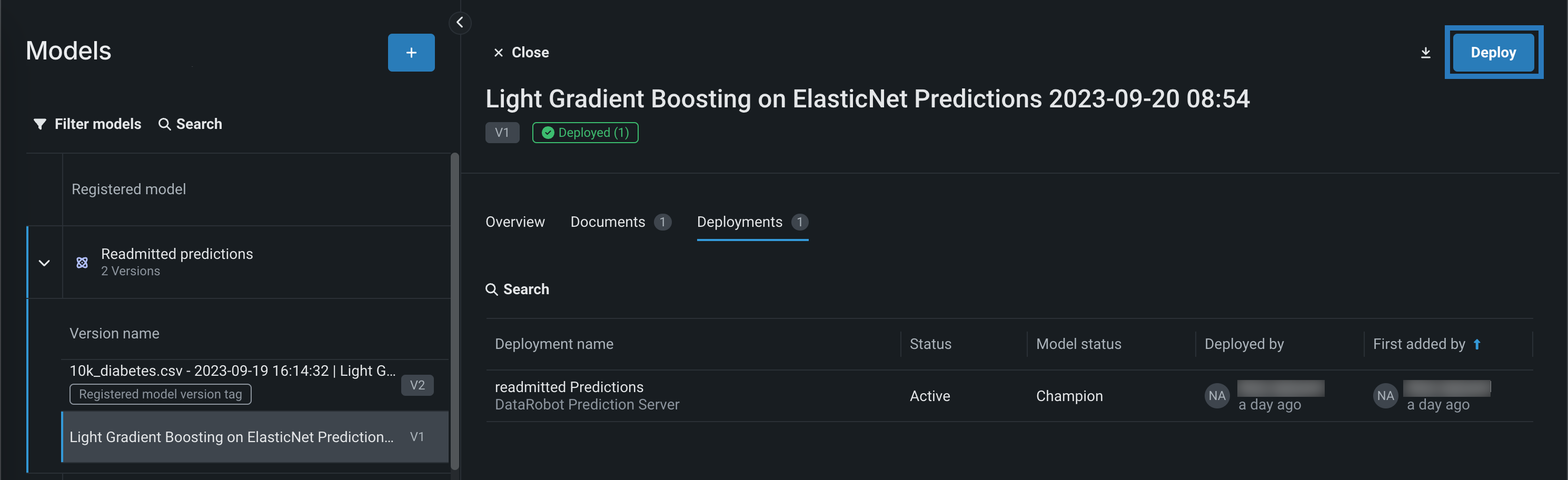 登録済みモデルバージョンパネルのいずれかのタブの右上隅で、デプロイをクリックします。