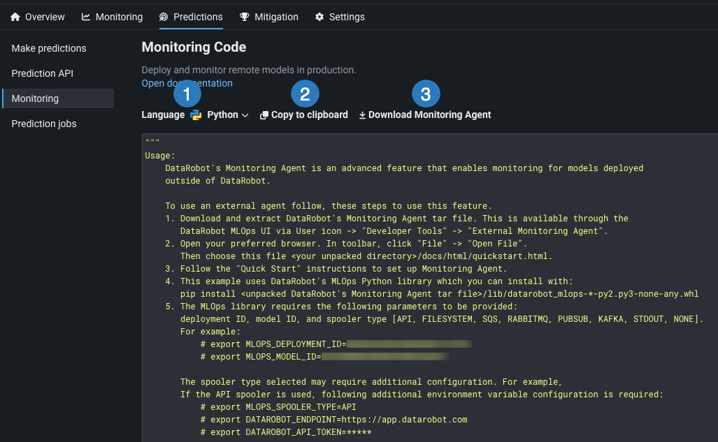 | 2 | クリップボードにコピー | 選択した言語で監視スニペットをコピーして、外部モデルデプロイの監視を実施します。 |