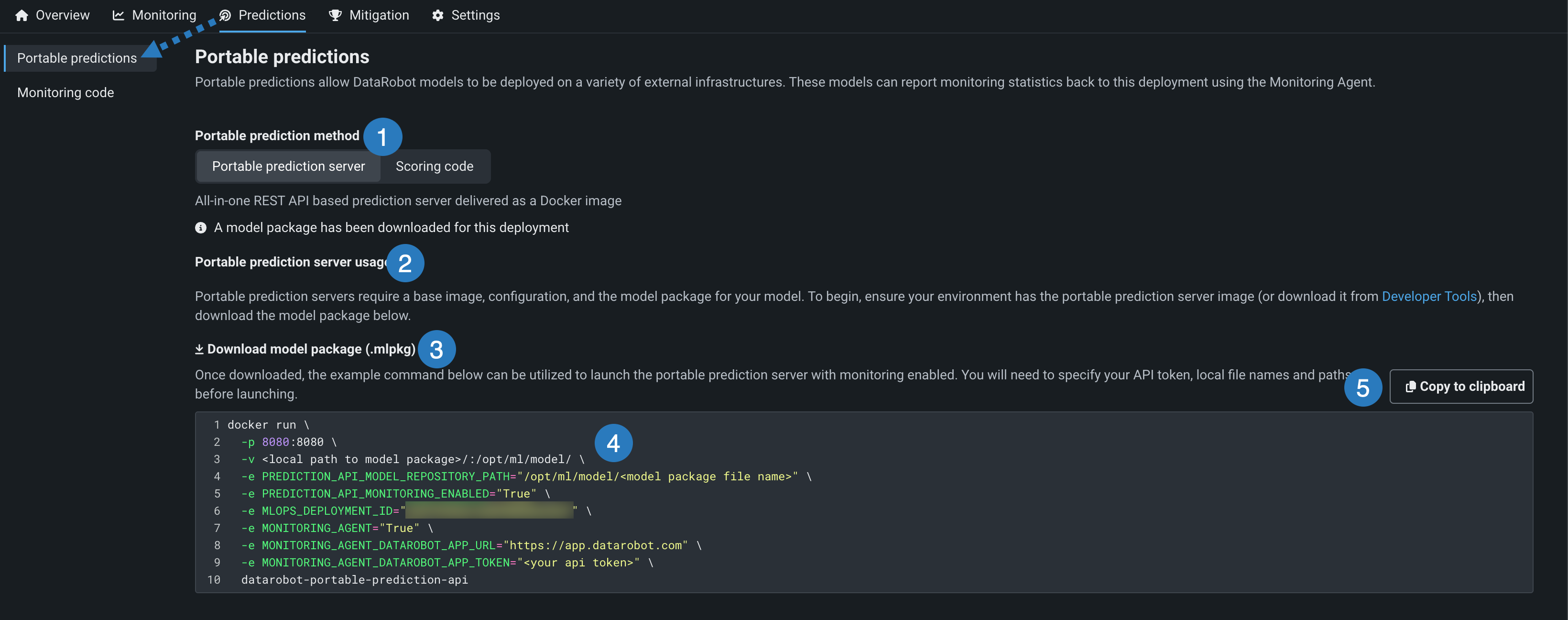 | 4 | Dockerスニペット | モデルパッケージをダウンロードしたら、Dockerスニペットを使用して、モニタリングが有効になっているモデルのポータブル予測サーバーを起動します。 起動する前に、APIキー、ローカルファイル名、パス、[モニタリング]{1}を指定する必要があります。 |
