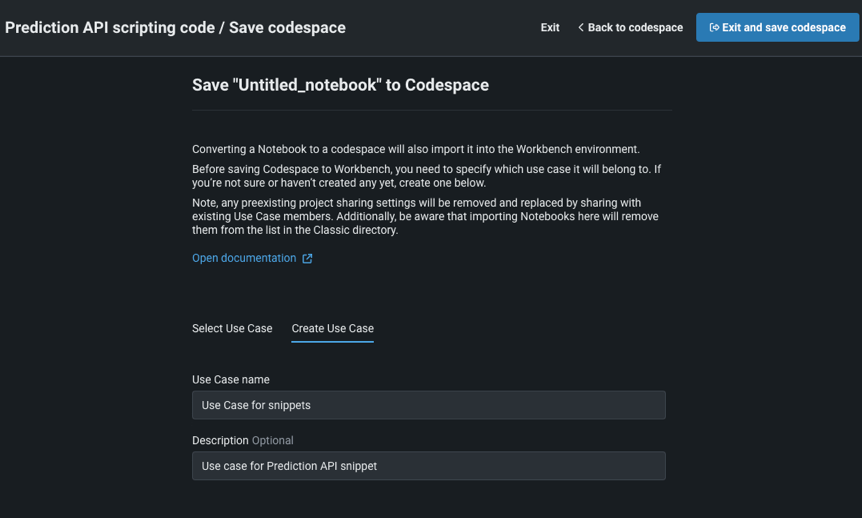 Codespaceは ユースケースに属しているため、codespaceを保存するには、既存のユースケースを指定するか、新しいユースケースを作成する必要があります。 ユースケースが選択されたら、終了してCodespaceを保存を再度クリックします。 これで、スニペットがユースケースの一部としてcodespaceに保存されます。