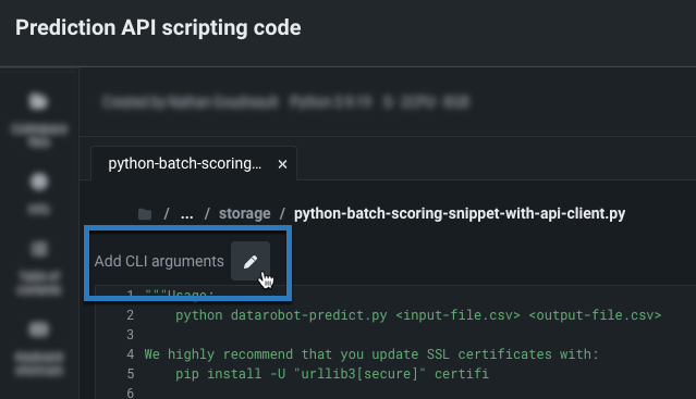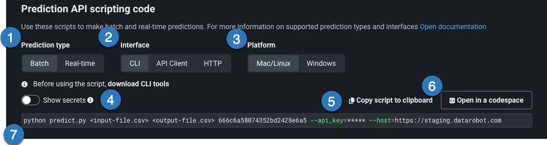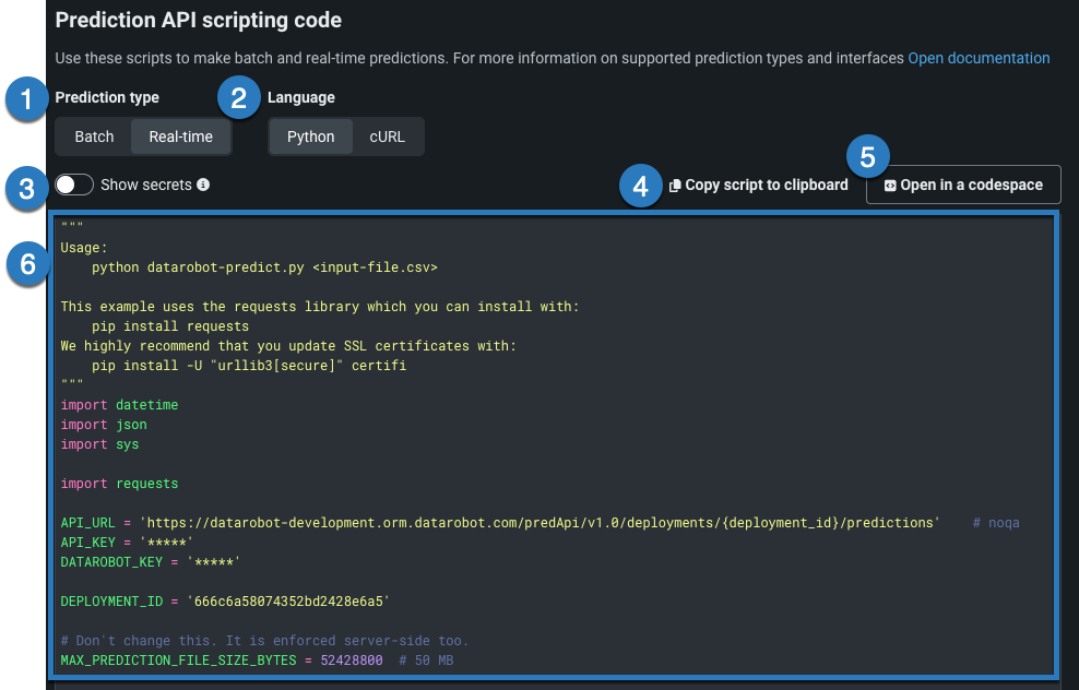 DataRobotは、スコアリングを目的としたCSVまたはJSONファイルの送信に必要なコマンドと識別子を含むサンプルPythonコードを提供します。 このコードは 予測APIと共に使用することができます。 予測APIスクリプティングコードを使用するには、予測を行うデプロイを開き、予測 > 予測APIをクリックします。 予測APIスクリプトコードのページでは、バッチおよびリアルタイム予測のためのいくつかのスクリプトから選択できます。 提供されたサンプルに従い、APIを介してモデルを運用アプリケーションに統合する場合は必要な変更を加えます。