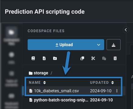 Codespaceでは、ファイルストレージに完全にアクセスできます。 アップロードボタンを使ってスコアリング用のデータセットを追加したり、スニペット実行後に予測出力(output.json、output.csvなど)をcodespaceファイルのディレクトリに戻したりすることができます。 この例では、10k_diabetes_small.csvを入力ファイルとしてcodespaceにアップロードします。