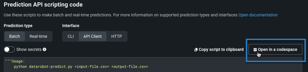 予測APIスニペットを開くには、Codespaceで開くをクリックします。