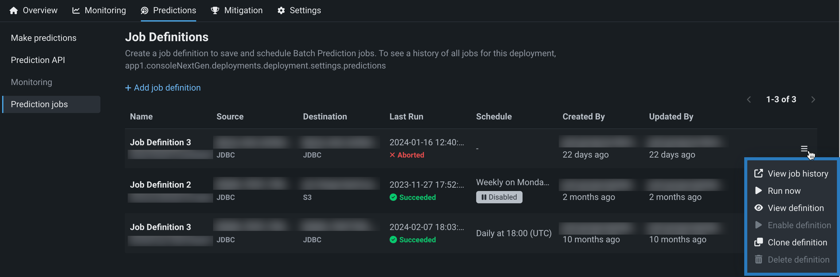 予測ジョブの定義を表示および管理するには、ダッシュボードでデプロイを選択し、ジョブ定義 > 予測ジョブタブに移動します。