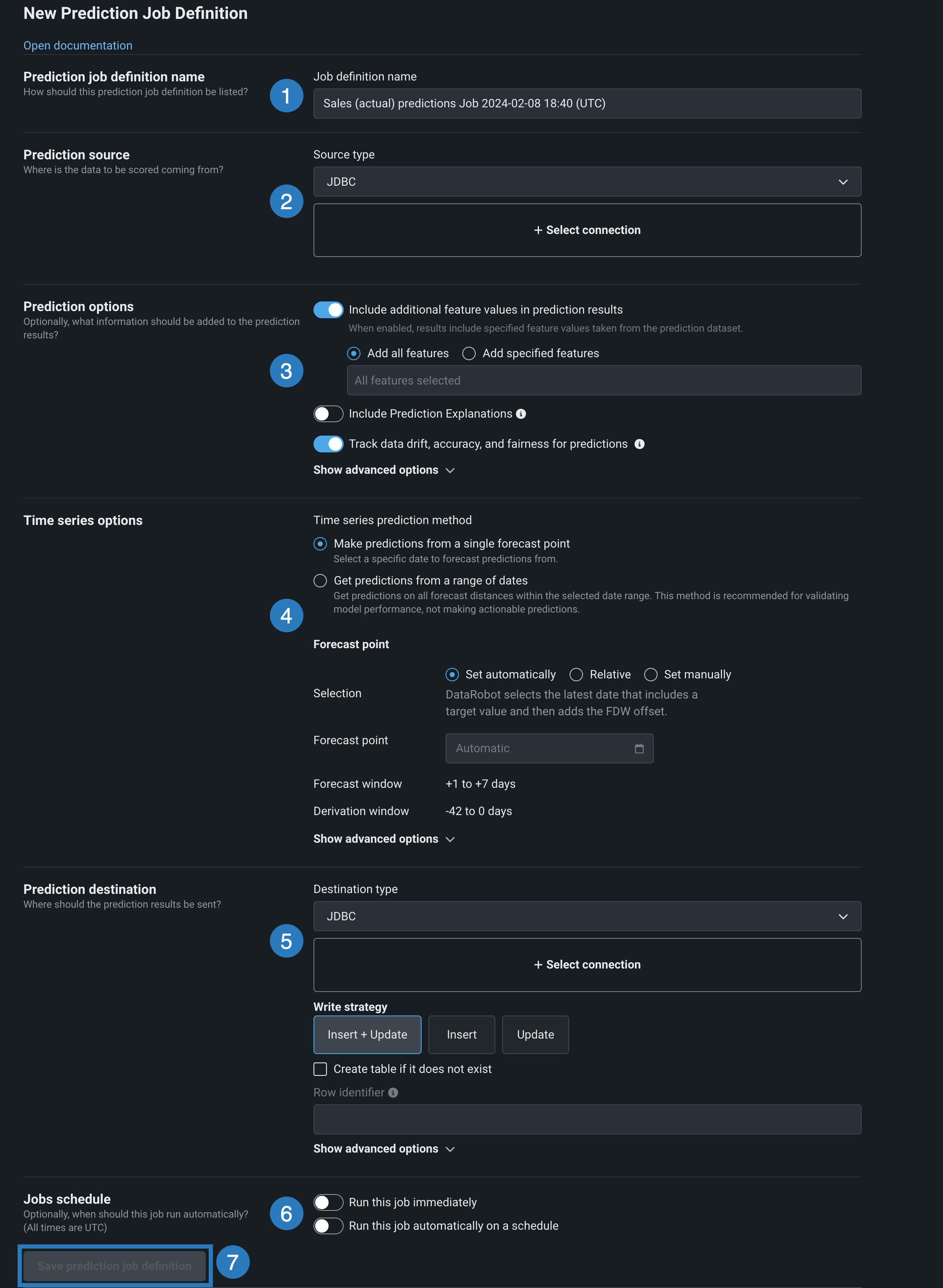 設定が完了したら、予測ジョブ定義を保存(または、このジョブをすぐに実行が有効になっている場合は、予測ジョブ定義を保存して実行)をクリックします。