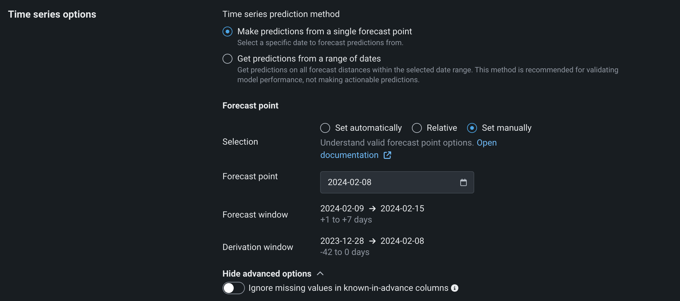 さらに、高度なオプションを表示をクリックし、事前に既知の列の欠損値を無視するを有効にすると、指定されたソースデータセットの事前に既知の列で欠損値があっても、予測を行うことができます。ただし、これは計算された予測に悪影響を及ぼす可能性があります。