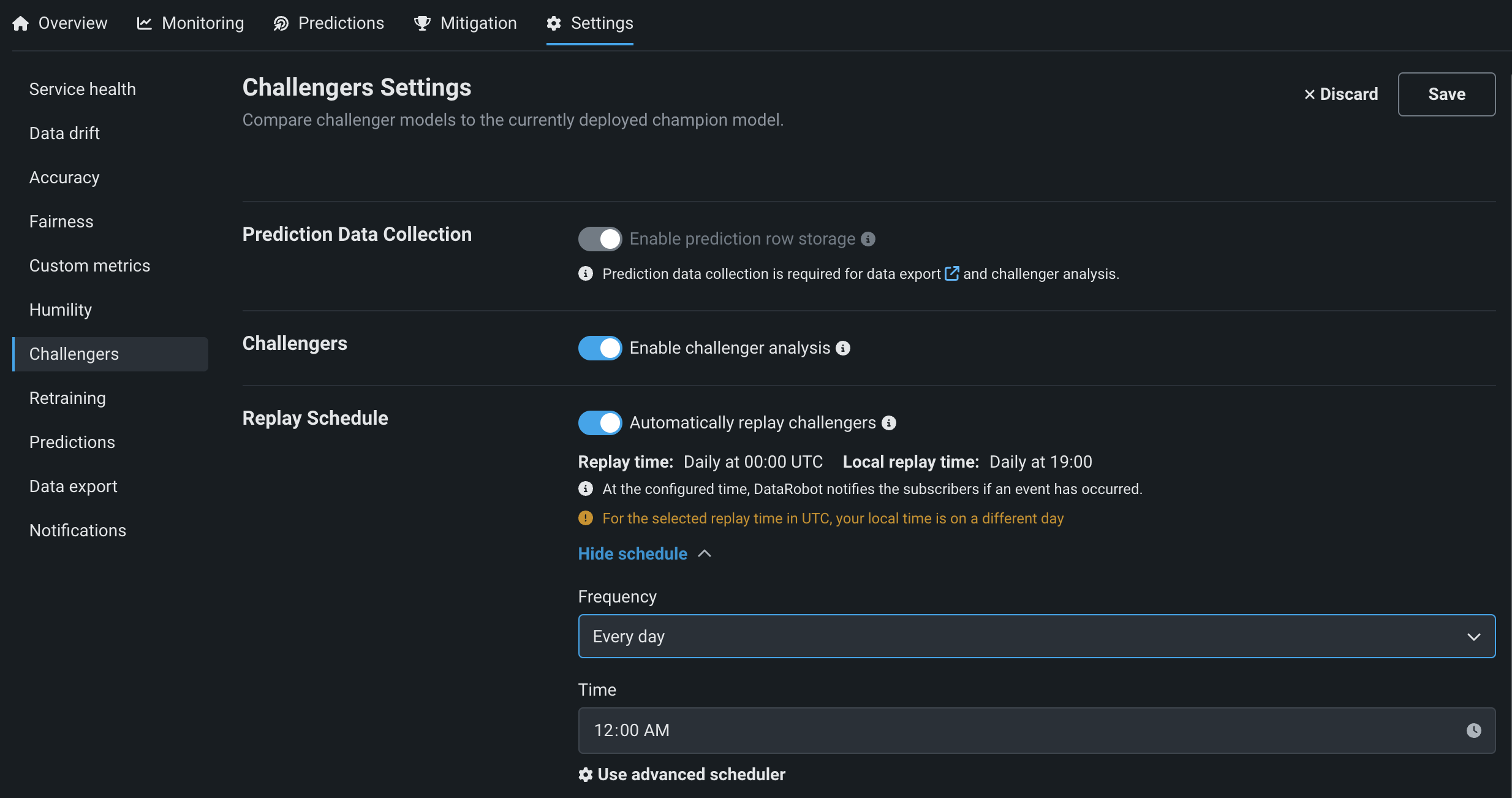 デプロイのチャレンジャーの設定ページでは、予測リクエストデータを行レベルで保存し、スケジュールに従って予測を再実行するために、以下の設定を行うことができます。
