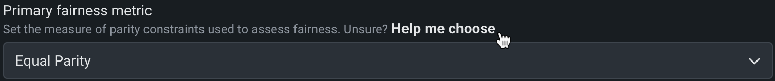 | プライマリー公平性指標 | 公平性の評価に使用される平等性制約の統計的尺度を選択します。 |