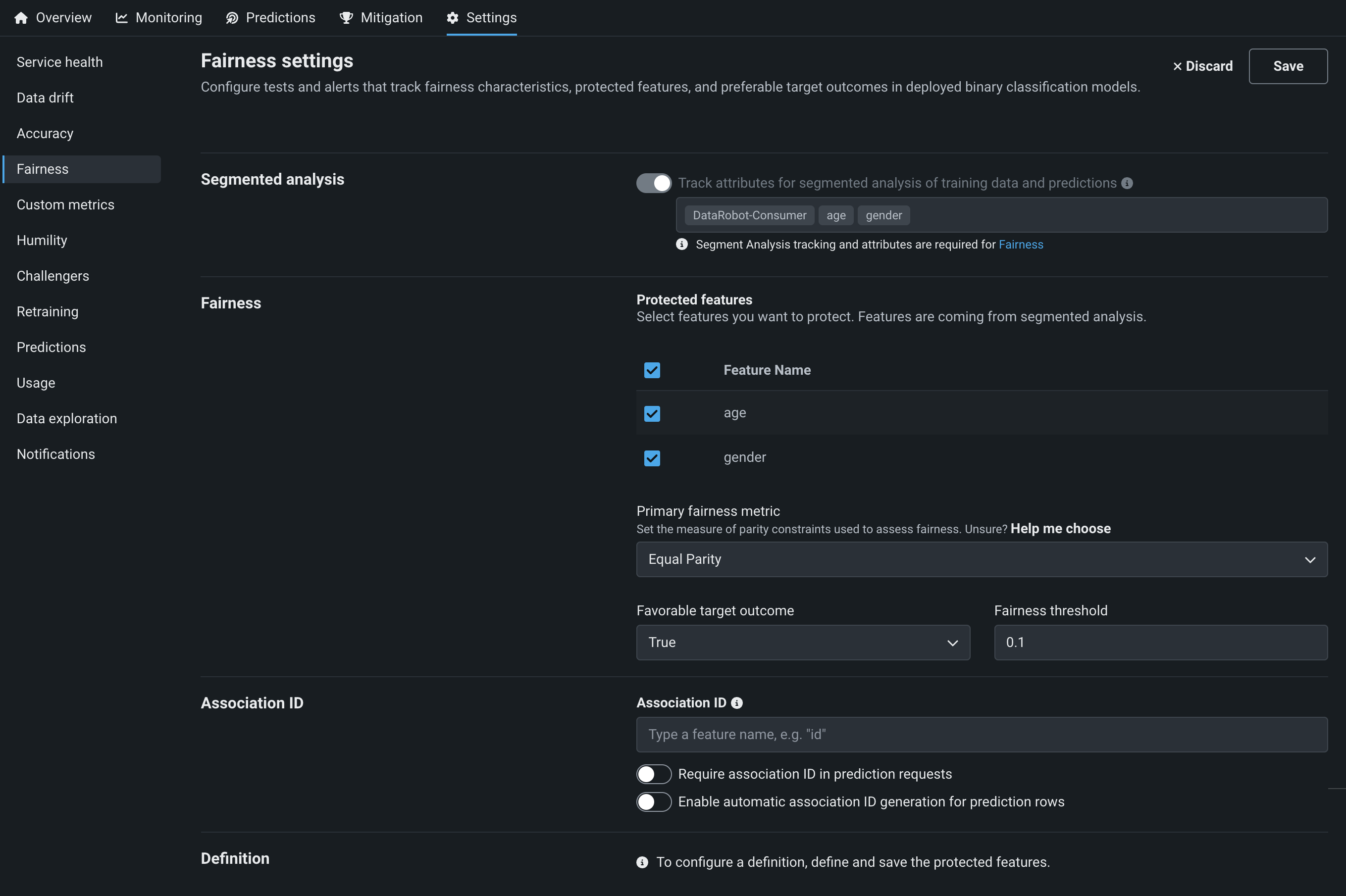 定義と通知セクションの設定にアクセスするには、公平性の設定を行って保存します。 公平性の監視設定を変更できるのは、デプロイオーナーだけです。ただし、ユーザーは通知が送信される条件を設定することができます。 コンシューマーは監視や通知の設定を変更できません。