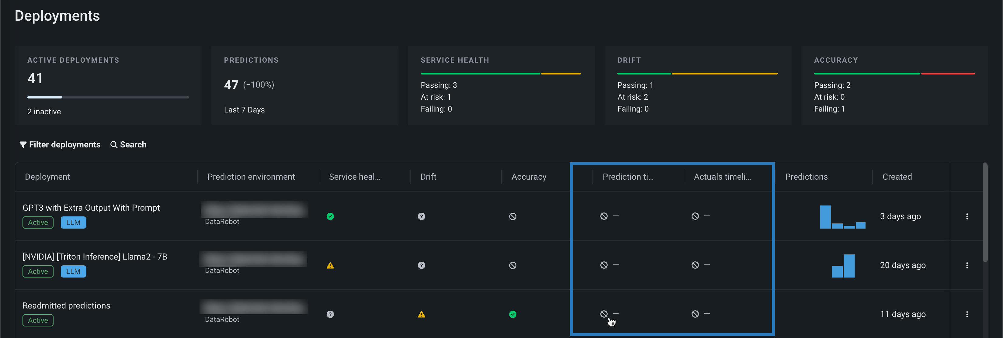予測値の適時性または実測値の適時性列のグレー/追跡なしアイコンをクリックして、そのデプロイの使用設定ページを開きます。