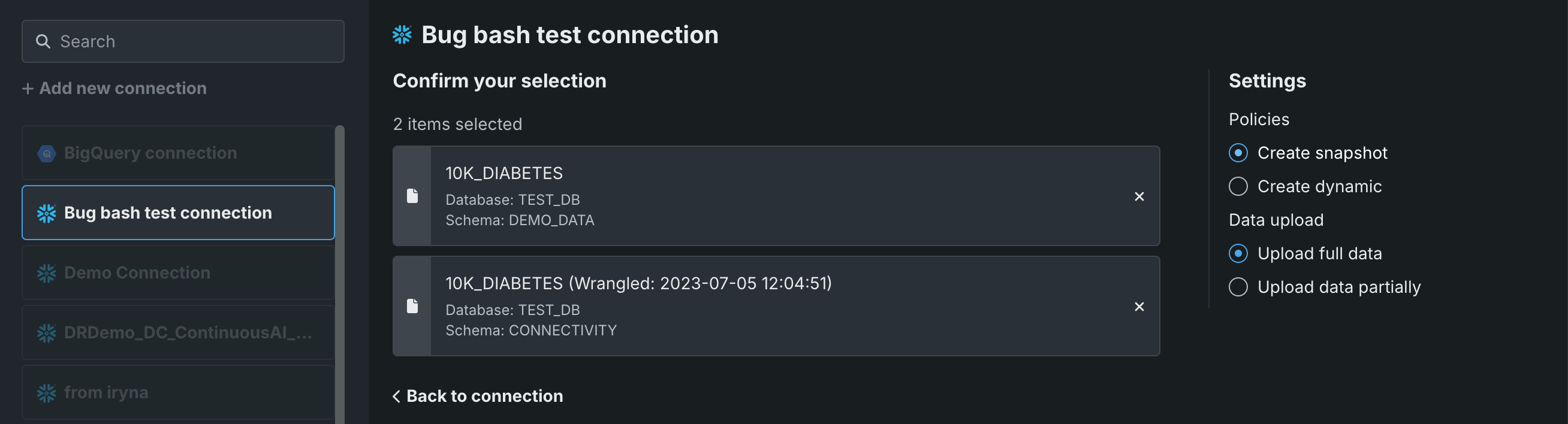 設定 説明 すべてのデータをアップロードする 全データセットのスナップショットを取るように指示します。 一部のデータをアップロードする 登録用に最初のN行を使用してスナップショットを取得します。 取込み行数を指定する必要があります。