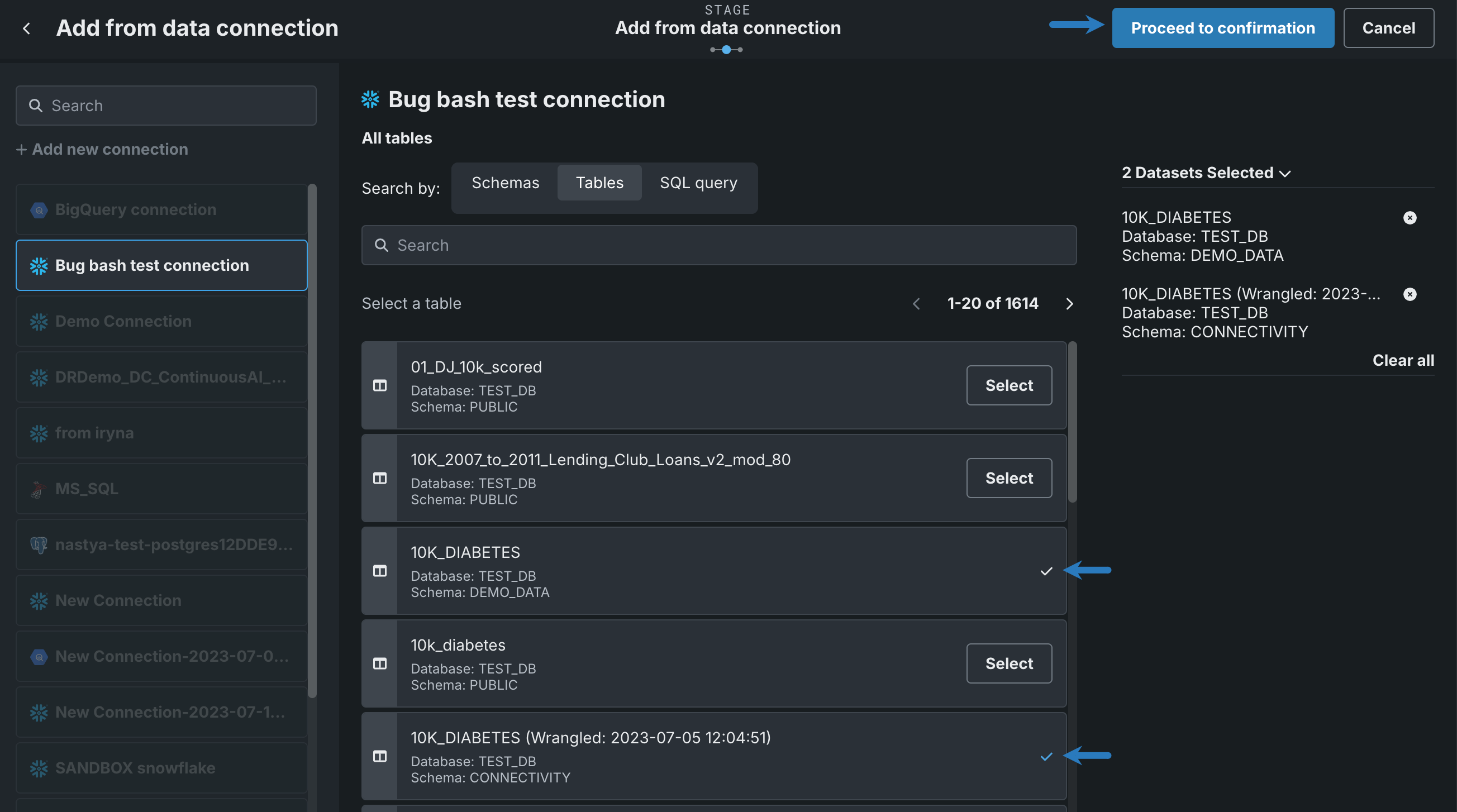 右側のパネルに表示されたデータセットのうち、追加したいものを選択し、確認に進むをクリックします。