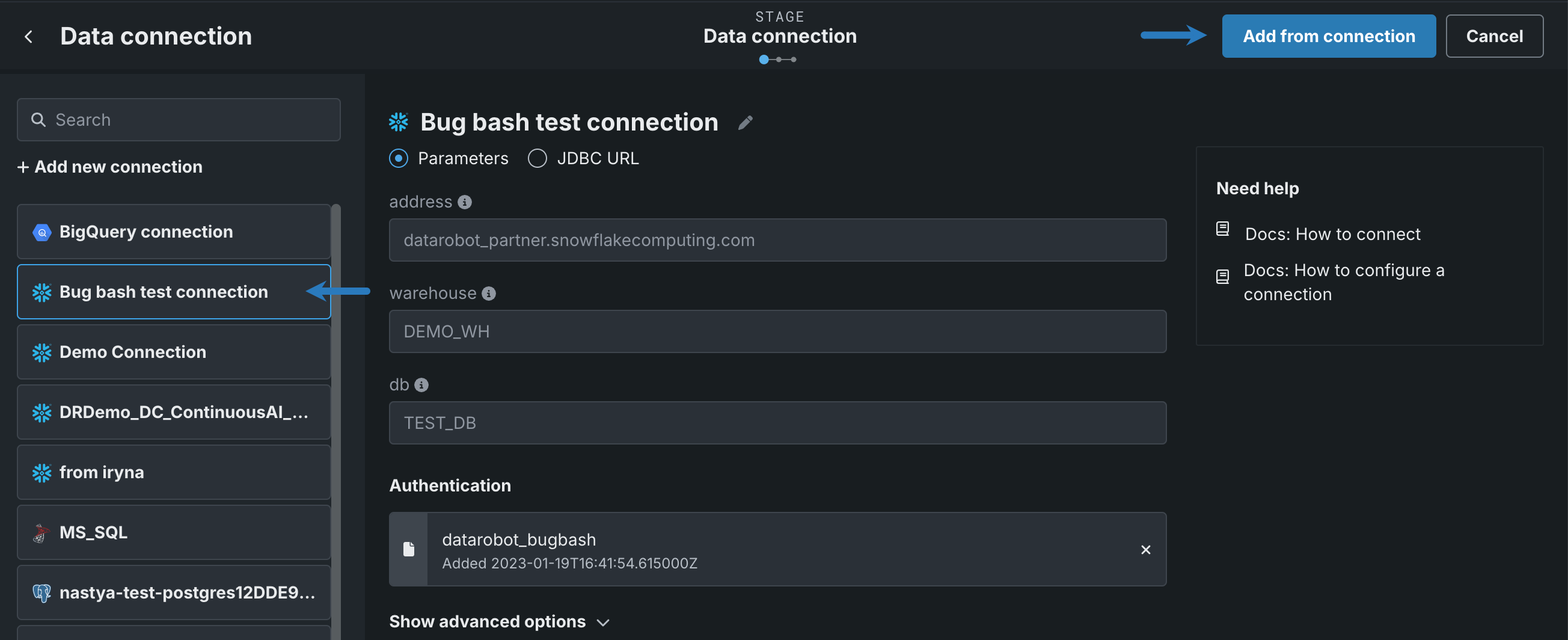 左側のパネルで、追加したいデータを保持しているデータ接続を選択し、接続から追加をクリックします。 接続がOAuthで認可されると、サインインを促される場合があります。