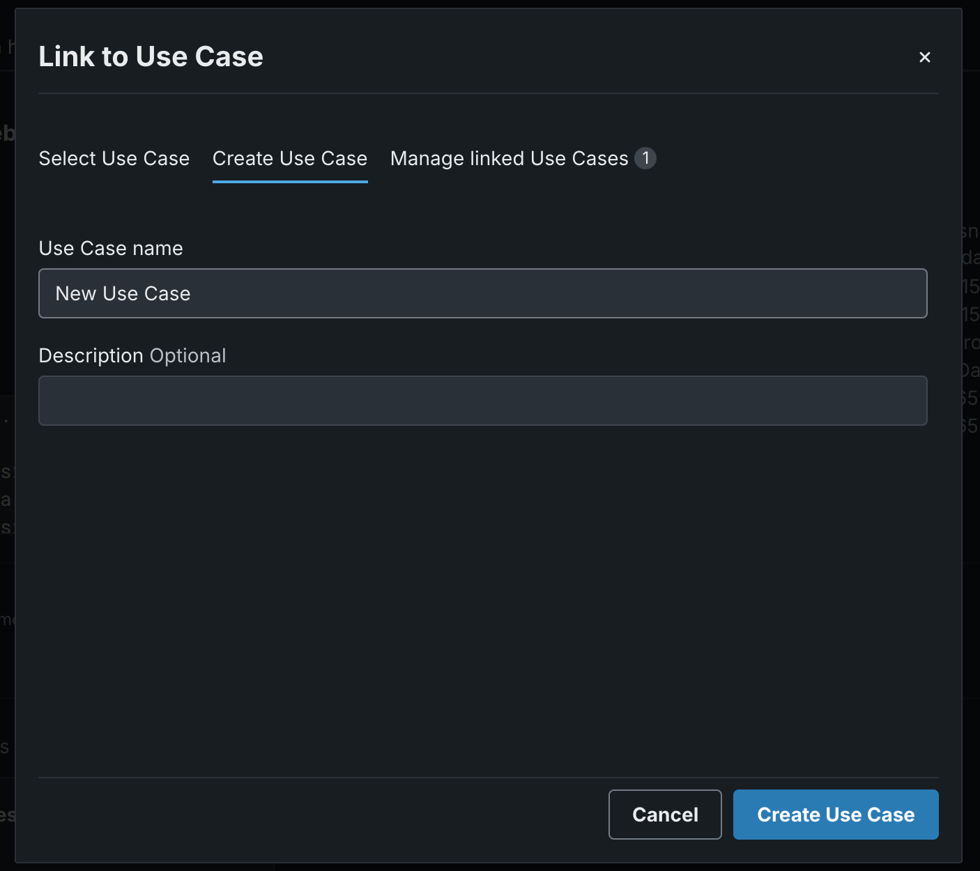 このタブでは、選択したデータセットで新しいユースケースを作成できます。 名前と説明(任意)を入力してから、ユースケースの作成をクリックします。