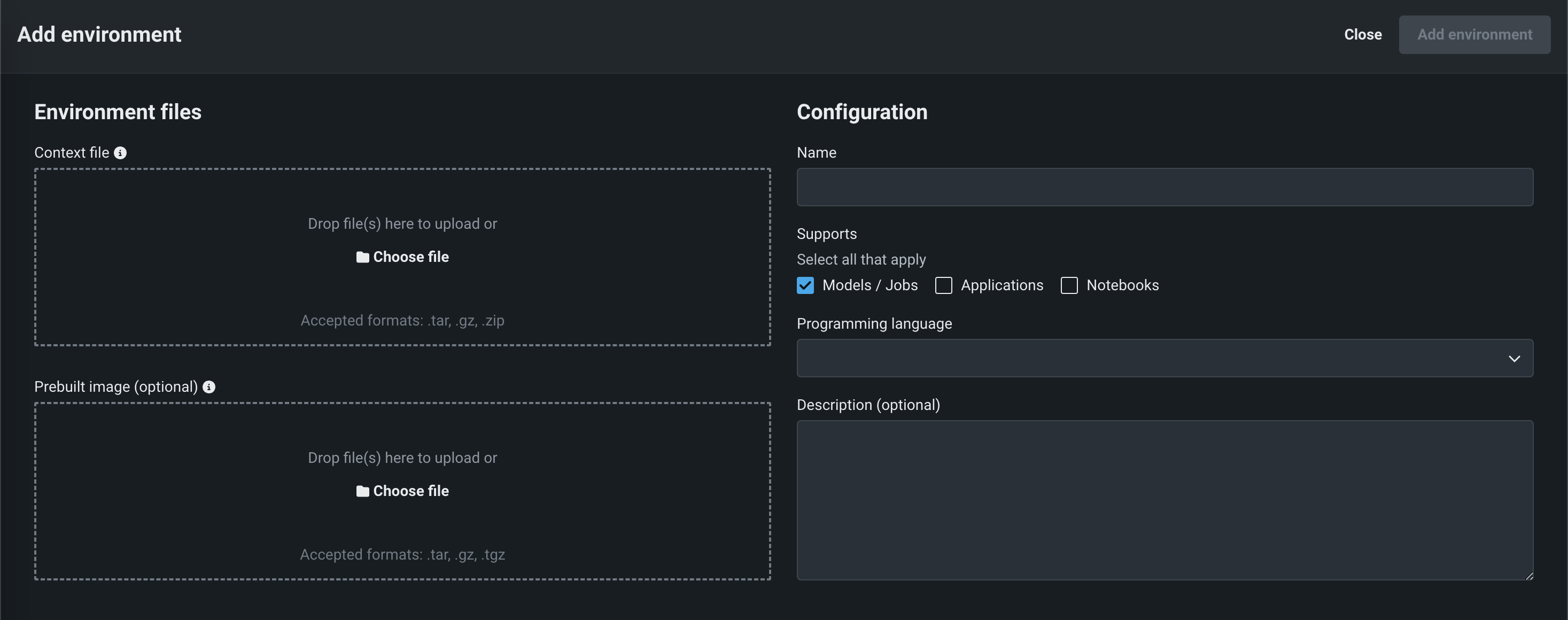 | コンテキストファイル | Dockerfileと環境イメージを構築するために必要なその他のファイルを含むアーカイブ。 ビルド済みイメージを指定する場合、このファイルは必要ありません。 |