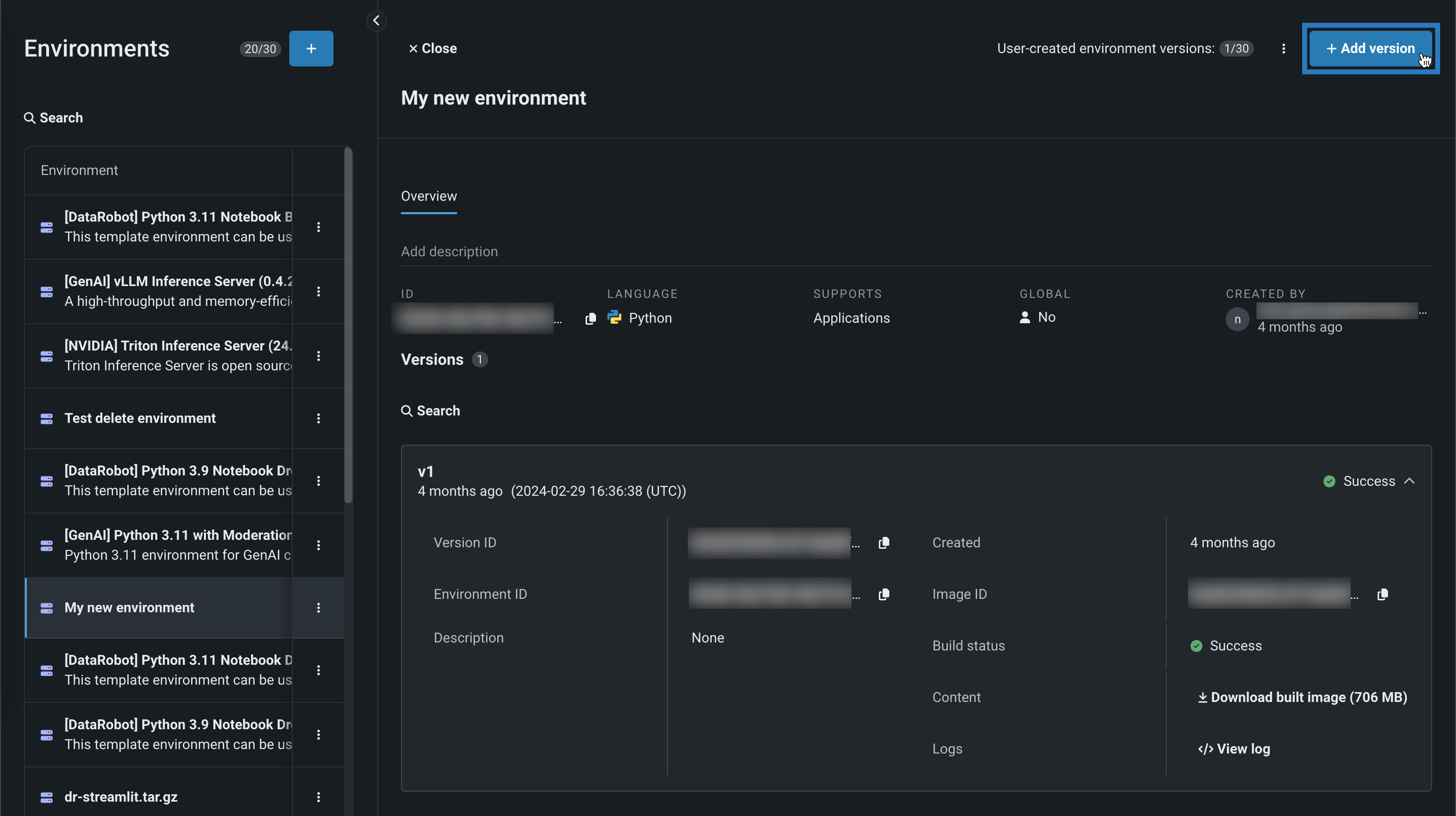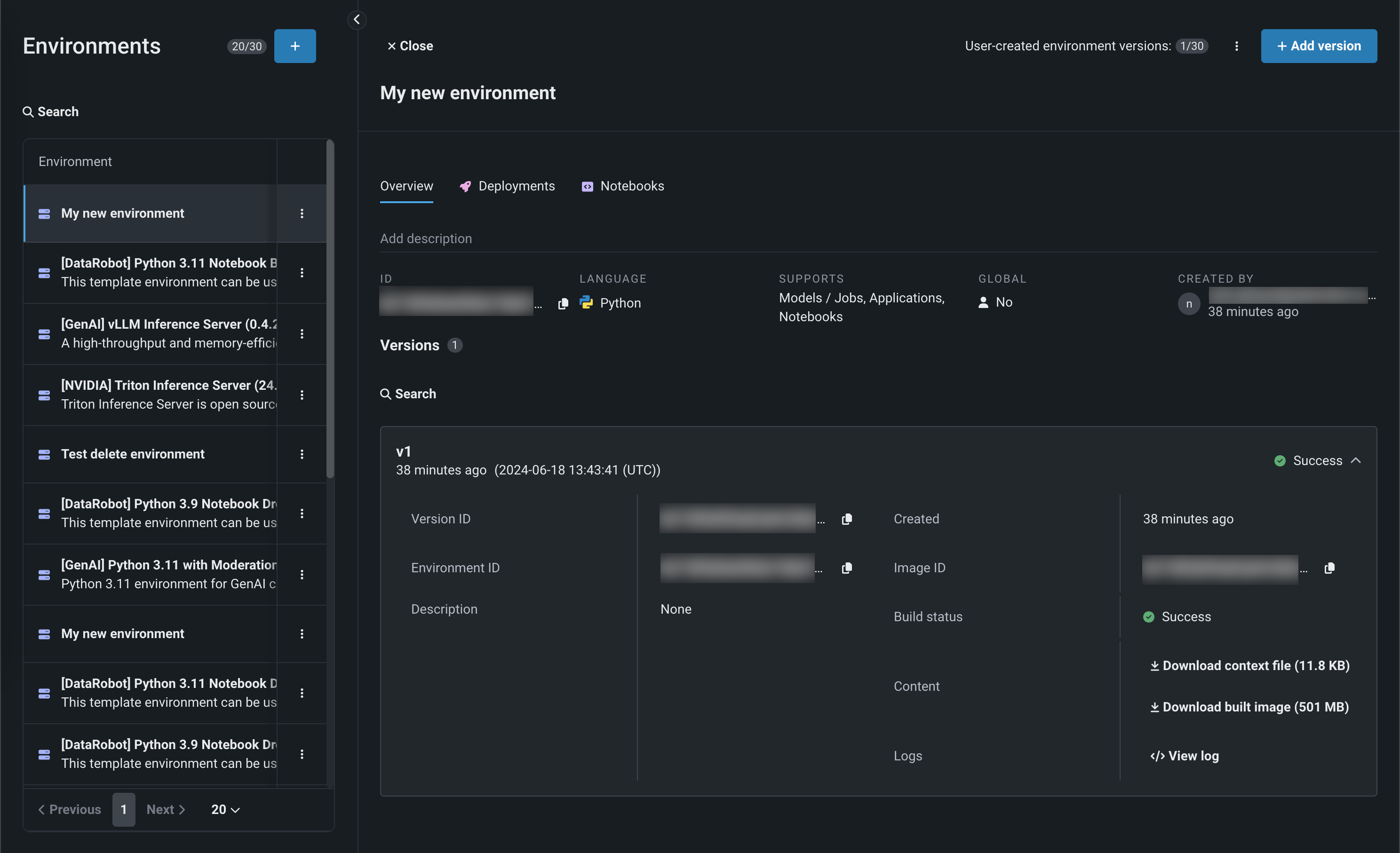 過去の環境バージョンはすべて保存され、カスタム環境の履歴にアクセスできます。