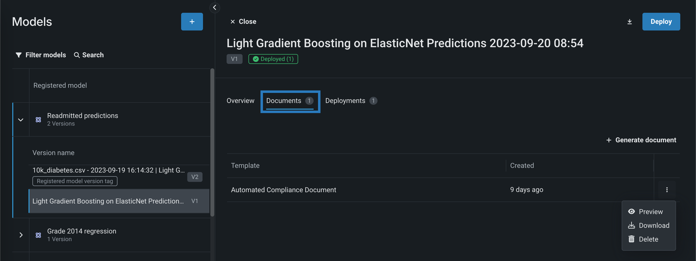 モデルタブの登録モデルのテーブルで、コンプライアンスドキュメントを生成したいバージョンを含む登録モデルをクリックすると、バージョンのリストが開きます。
