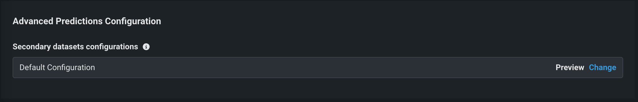 | セカンダリーデータセットの設定 | データセット設定をプレビューするか、データセット設定を変更するオプションが存在します。 デフォルトでは、プロジェクトを構築する際に使用された関係性で定義されたセカンダリーデータセット設定を使用して予測が作成されます。 他の設定を選択するには、新しいプライマリーデータセットをアップロードする前に変更をクリックします。 |