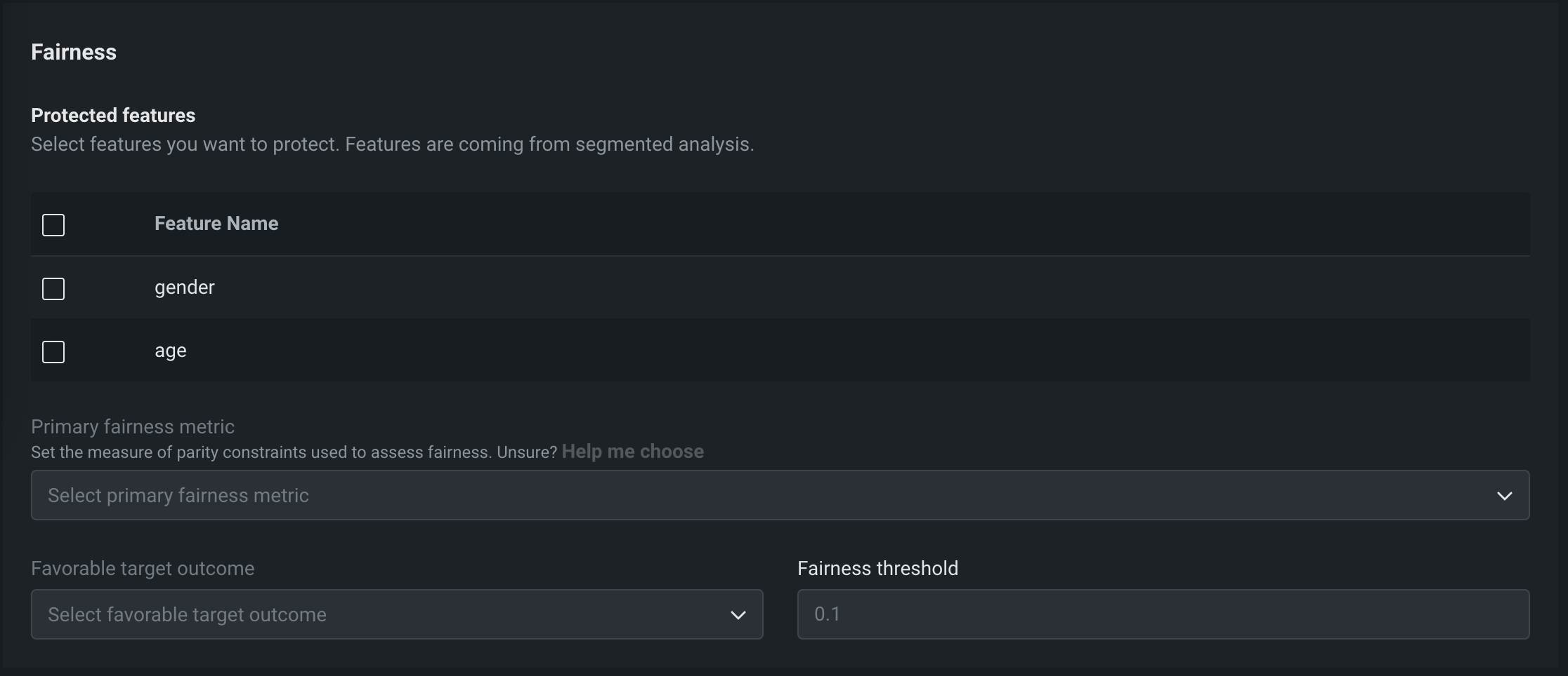 | 保護されている特徴量 | モデル予測の公平性を測定する際の基準となるデータセット列を特定します。これはカテゴリー列である必要があります。 |