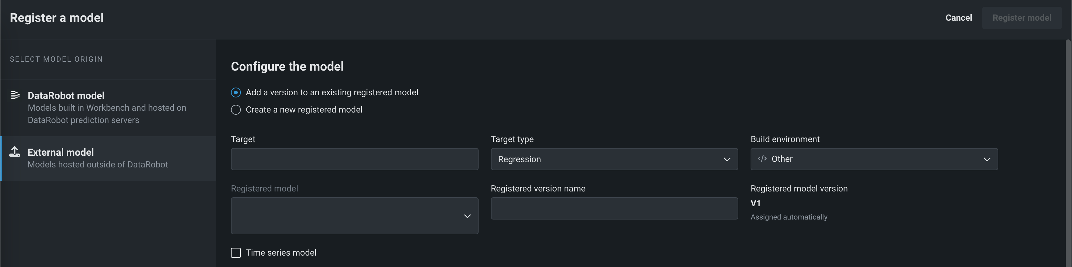 監視エージェントによって監視される外部モデルを登録するには、レジストリを通じて外部モデルを登録モデルまたはバージョンとして追加します。