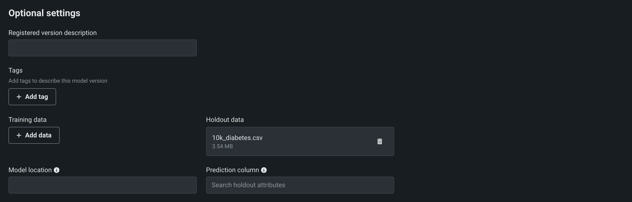 フィールド 説明 登録バージョンの説明 このモデルパッケージが解決するビジネス上の問題、またはより一般的に、このバージョンで表されるモデルについて説明します。 タグ + タグを追加をクリックし、モデルの バージョン にタグ付けするキーと値のペアごとに、キーと値を入力します。 新規モデルの登録時に追加されたタグがV1に適用されます。 トレーニングデータ ローカルまたはデータレジストリを介してアップロードされたトレーニングデータ。 ホールドアウトデータ ローカルまたはデータレジストリを介してアップロードされたホールドアウトデータ。 ホールドアウトデータを使用して、精度ベースラインを設定し、ターゲットドリフトモデルとチャレンジャーモデルのサポートを有効にします。 予測列 ホールドアウトデータをアップロードした場合、予測結果を含むホールドアウトデータセットの列名を入力します。 モデルの場所 DataRobotの外部で実行しているモデルの場所。 folder1/opt/model.tarなどのファイルパスの形式で場所を入力します。 -