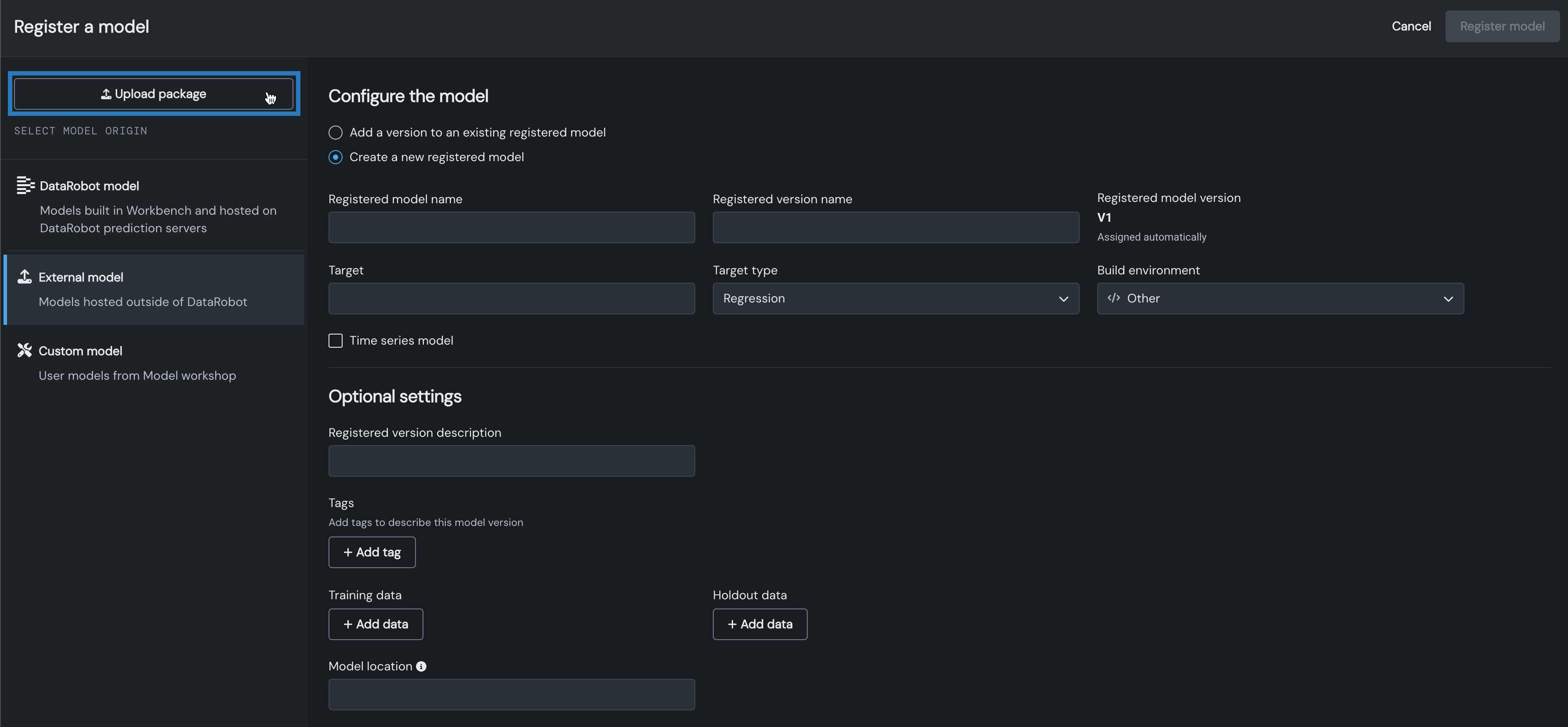 モデルの登録パネルで、 パケージのアップロードをクリックします。
