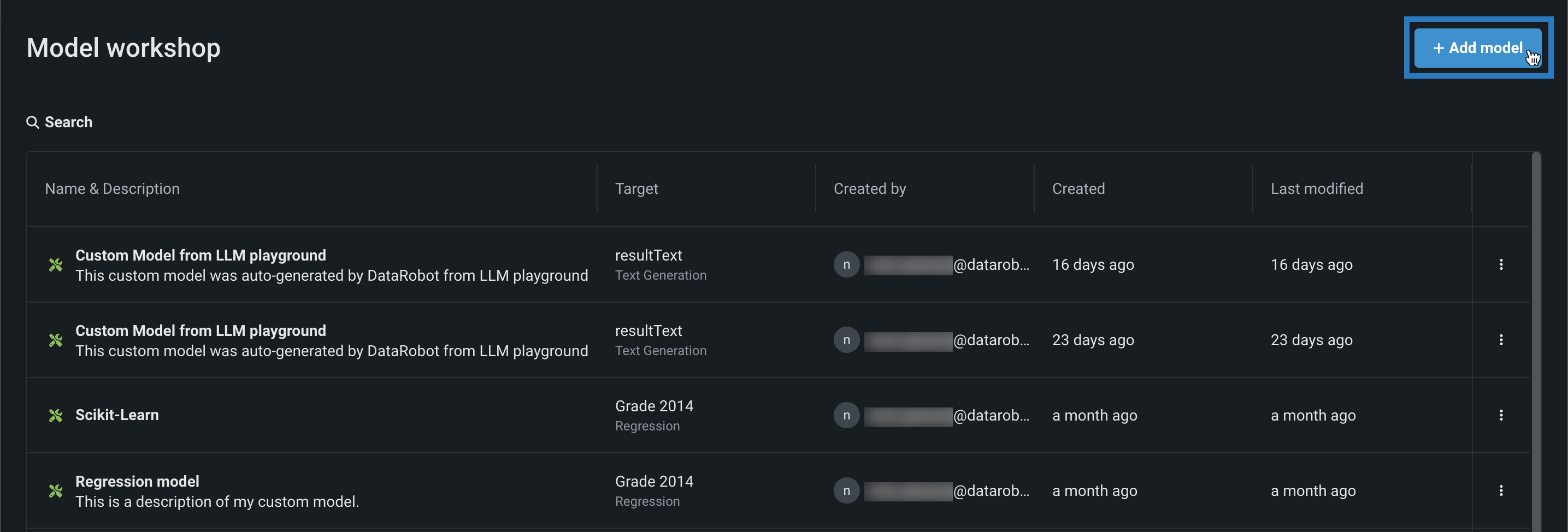 レジストリ > モデルワークショップをクリックします。 このタブには、作成したモデルが一覧表示されます。
