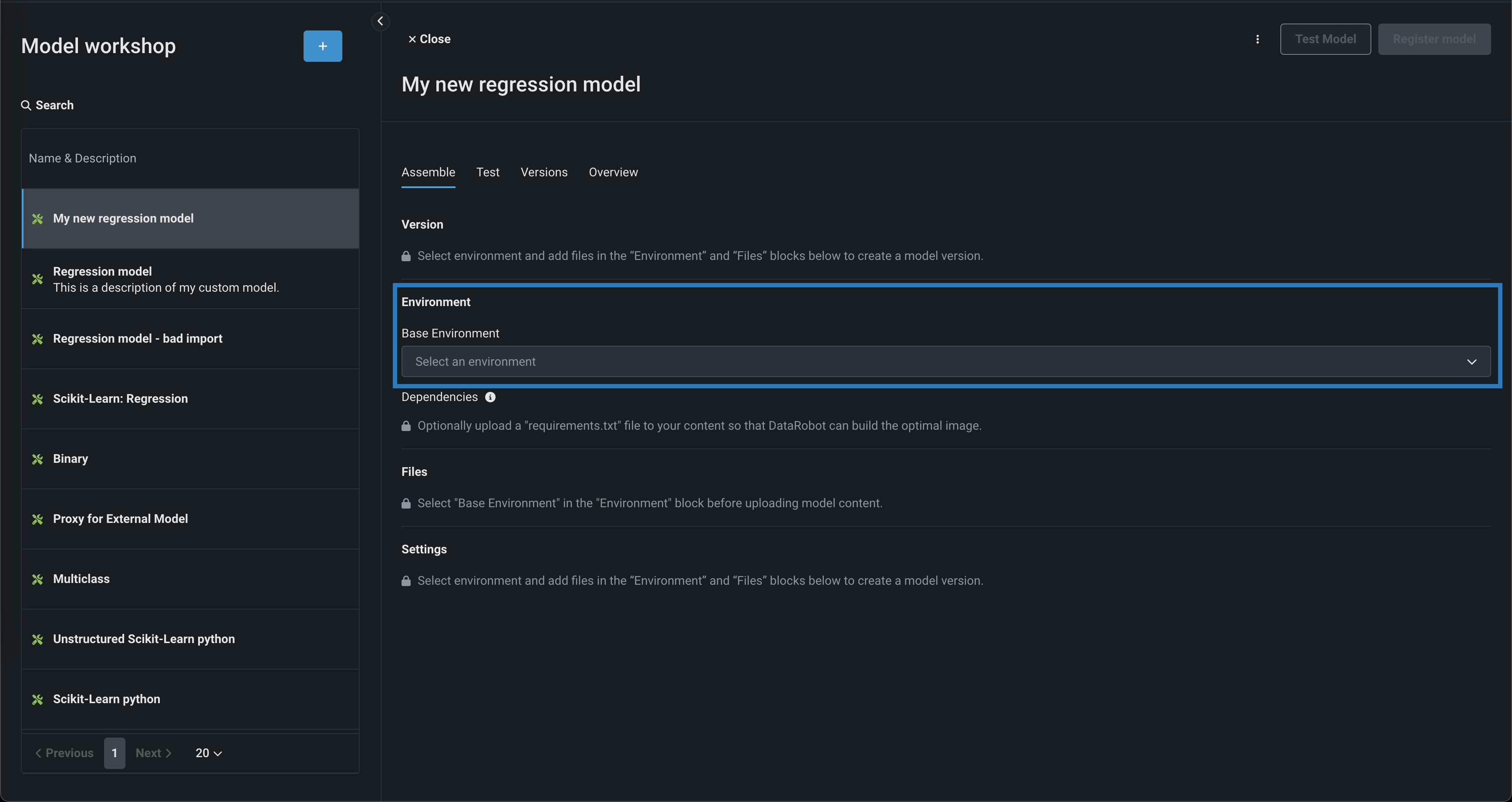 モデル環境は、カスタムモデルのテストとデプロイに使用されます。 基本環境ドロップダウンリストには、 ドロップインモデル環境と、作成可能な カスタム環境が含まれています。 デフォルトでは、カスタムモデルは、正常に構築され、選択された環境の最新バージョンを使用します。