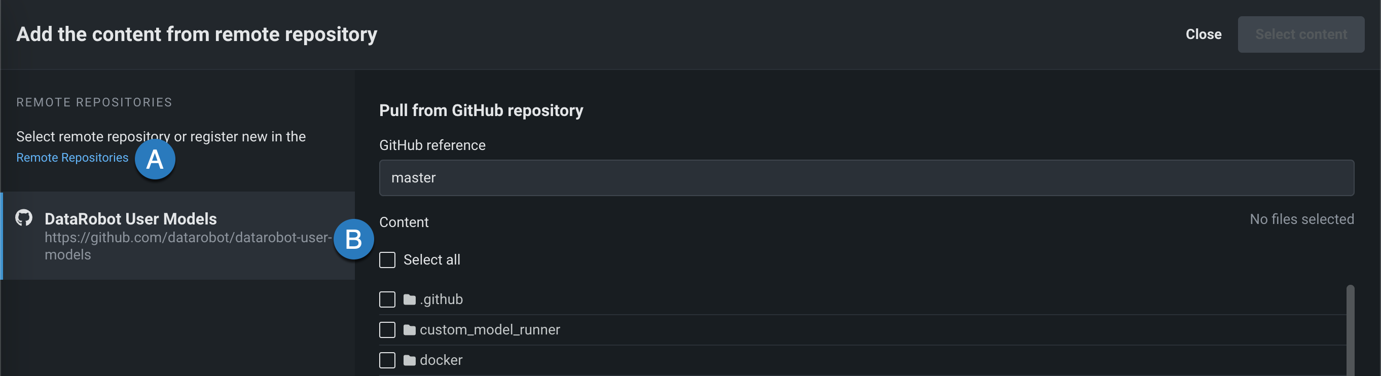 ファイルセクションで、 アップロード > リモートリポジトリをクリックすると、リモートリポジトリからコンテンツを追加パネルが開きます。 リモートリポジトリをクリックして、 新しいリモートリポジトリを登録(A)するか、既存のリモートリポジトリを選択(B)できます。