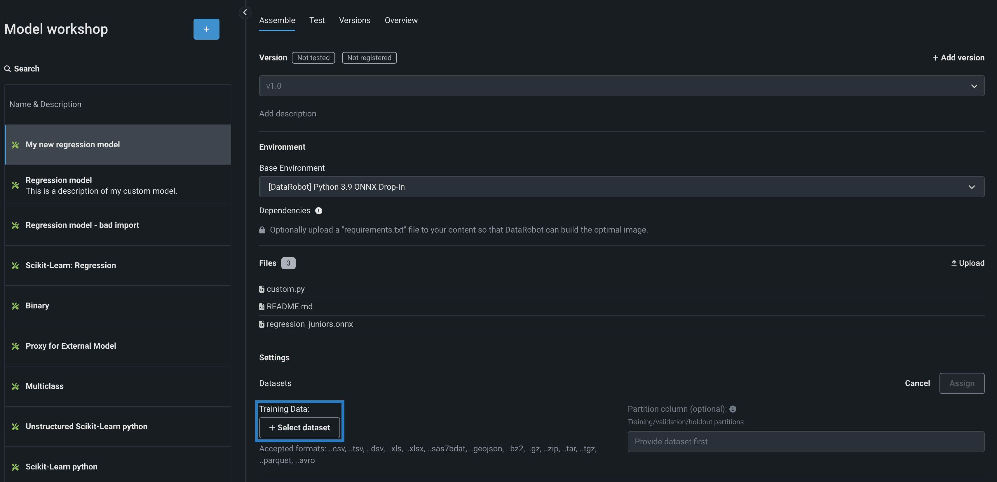 カスタムモデルは、ユーザーが作成して、モデルワークショップを介して(ファイルのコレクションとして)、DataRobotにアップロードできる事前トレーニング済みのモデルです。 カスタムモデルは、以下のうちいずれかの方法で構築できます。