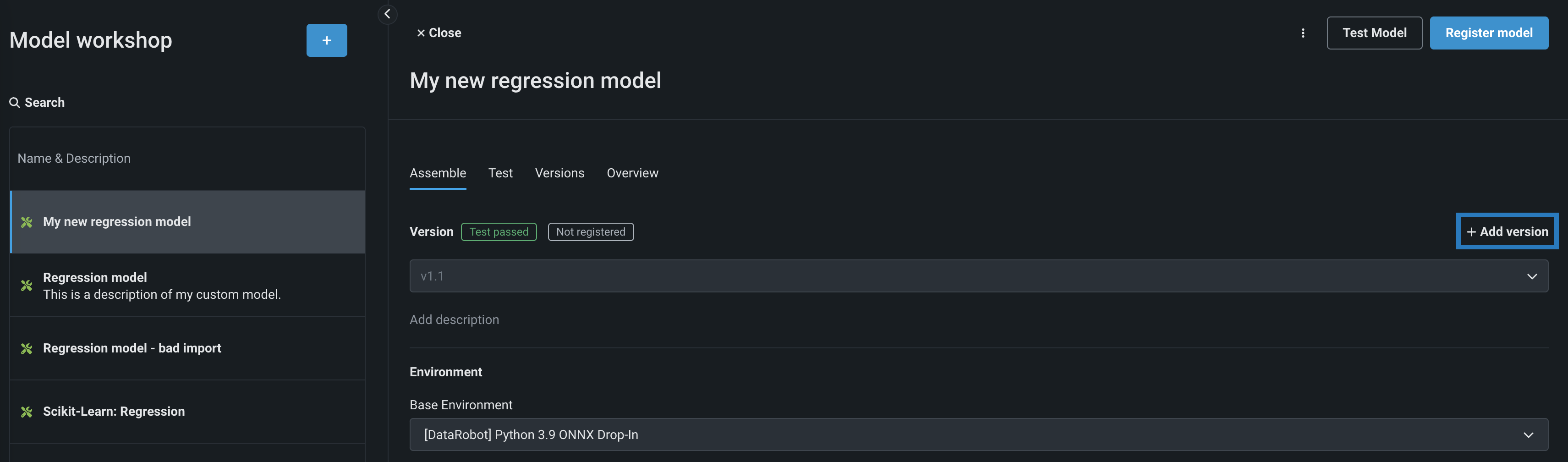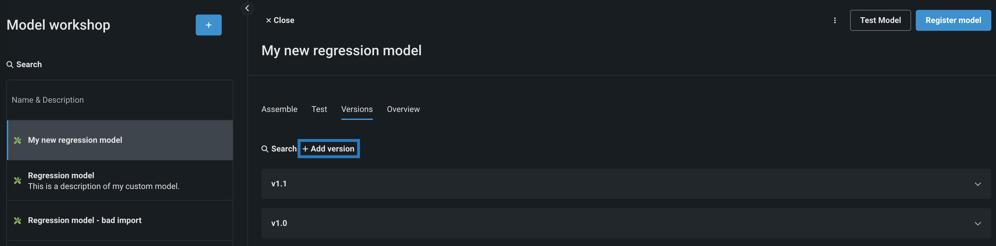 バージョンを作成するカスタムモデルを開き、アセンブルタブのバージョンセクションで+ バージョンを追加をクリックします。