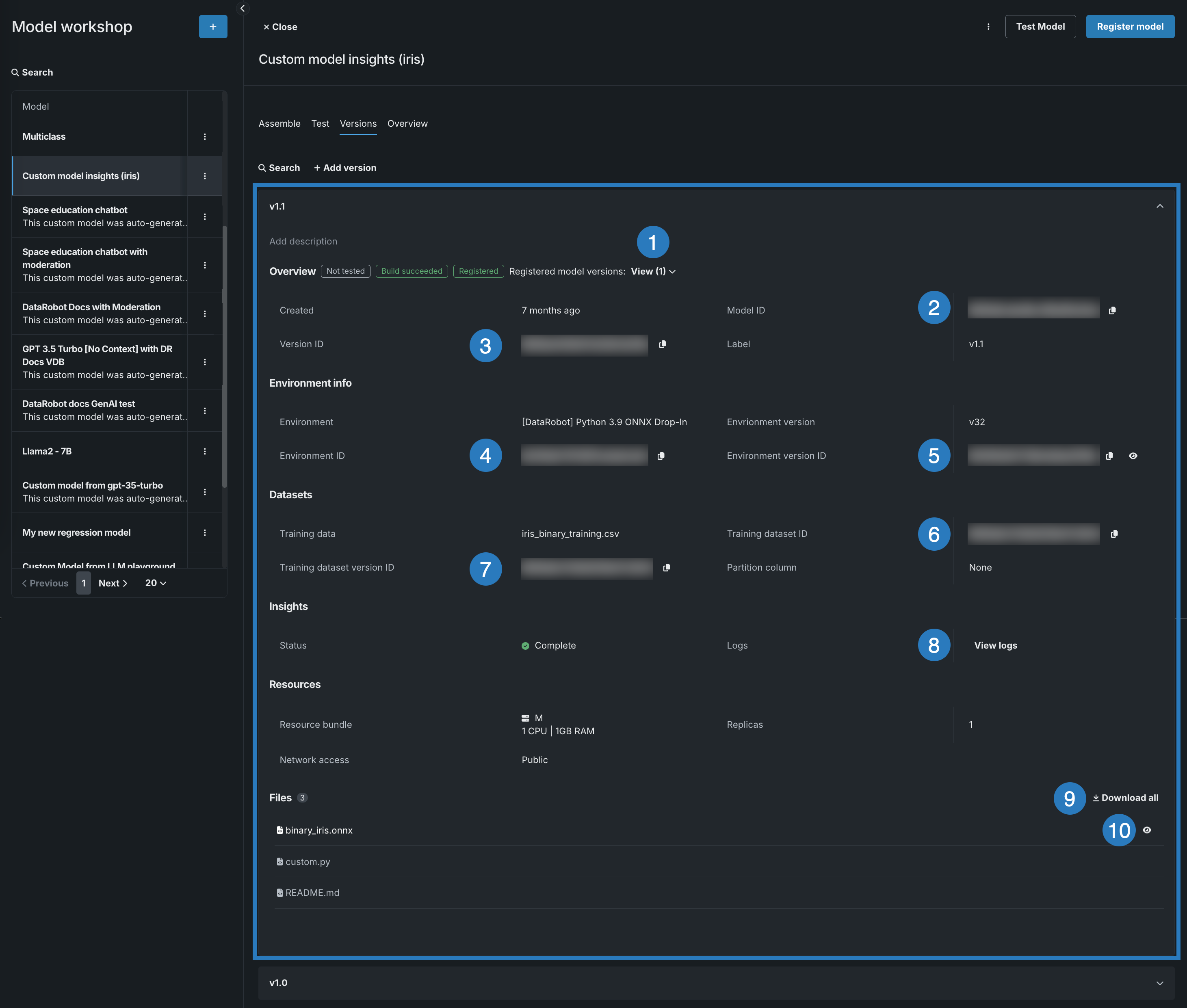 | 1 | 概要セクションヘッダーの横にある登録済みモデルバージョンフィールドで、表示 をクリックすると、カスタムモデルバージョンから登録されたモデルのリストが表示されます。 リストに登録されているモデルバージョンをクリックして、レジストリで開きます。 |