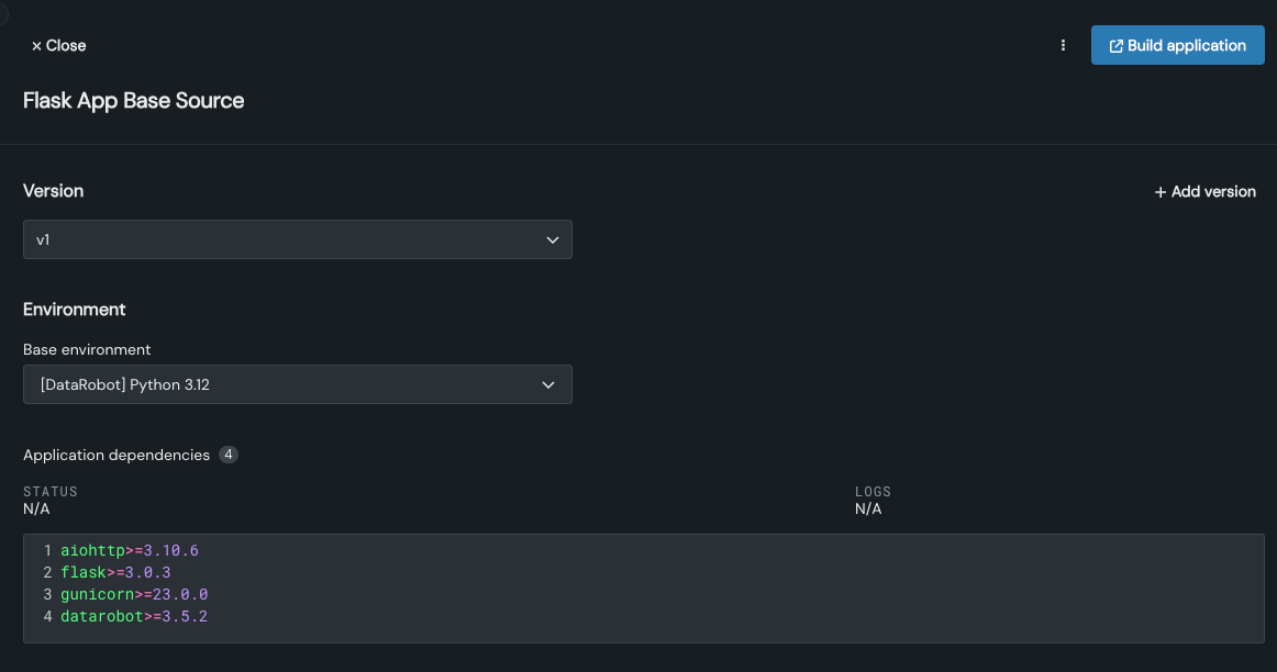 DataRobotは、テンプレートの内容が入力されたアプリケーションソースページを表示します。 アプリケーションの依存関係とアプリケーションソースのファイルを確認して、アプリケーションを構築をクリックします。 DataRobotがアプリケーションを初期化する時間を与えます。
