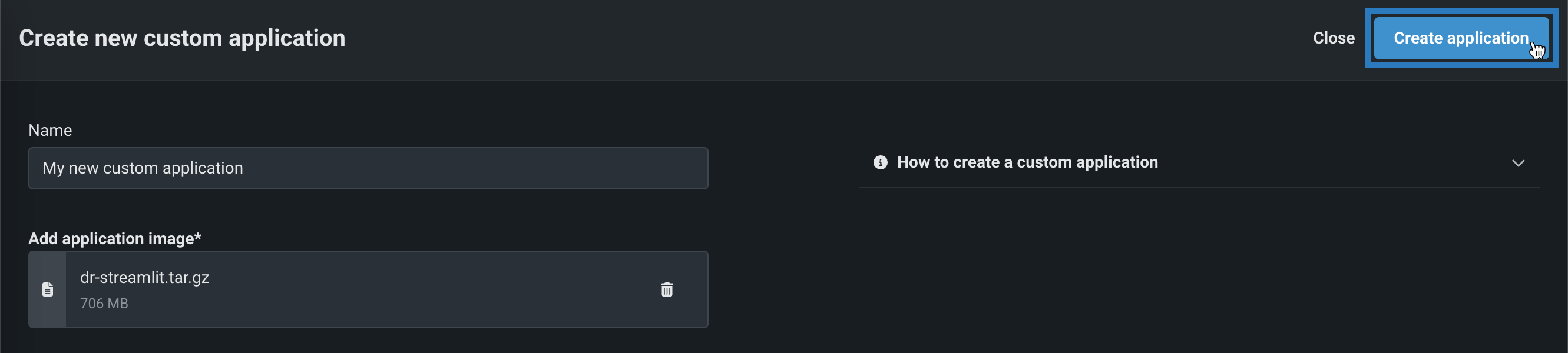 カスタムアプリケーションtar、gzまたはtgzアーカイブがある場合、DataRobotレジストリのアプリケーションページに画像をアップロードできます。