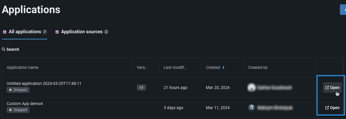 カスタムアプリケーションが、そのソースから構築されたアプリケーションのリストに追加されます。 構築されたら、開くをクリックしてアプリケーションを表示できます。