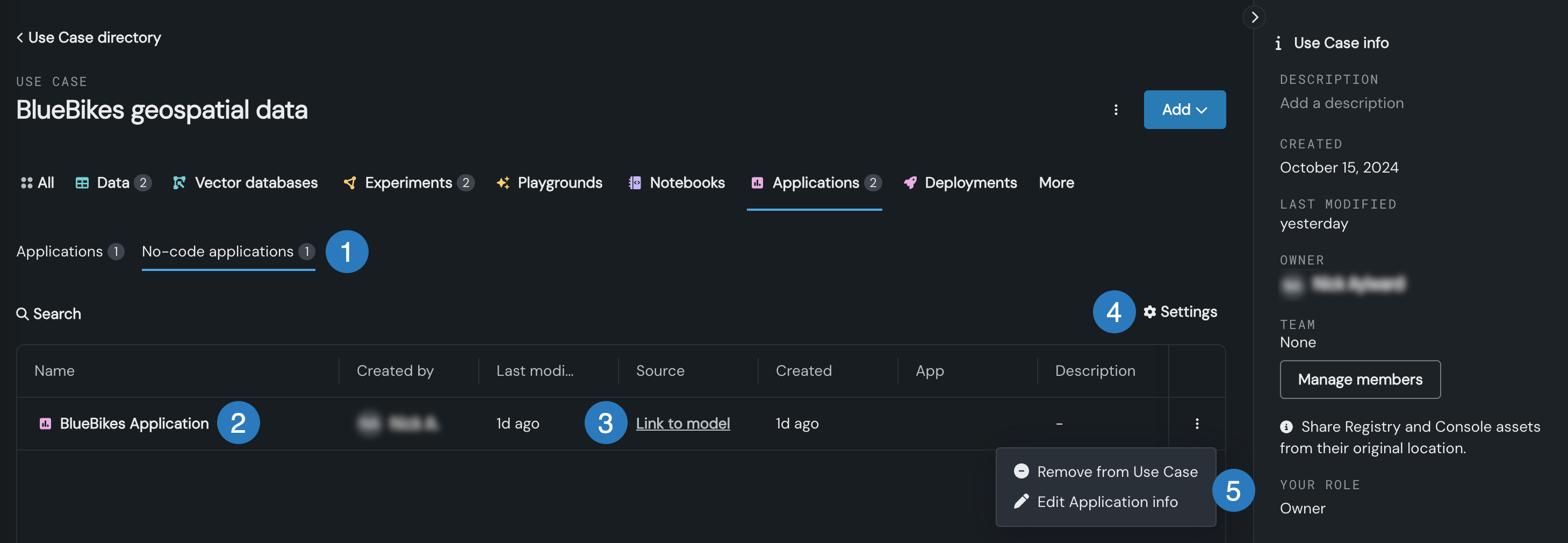 | 5 | アクションメニュー | クリックしてユースケースからノーコードアプリケーションを削除するか、アプリケーション情報を編集します。 |