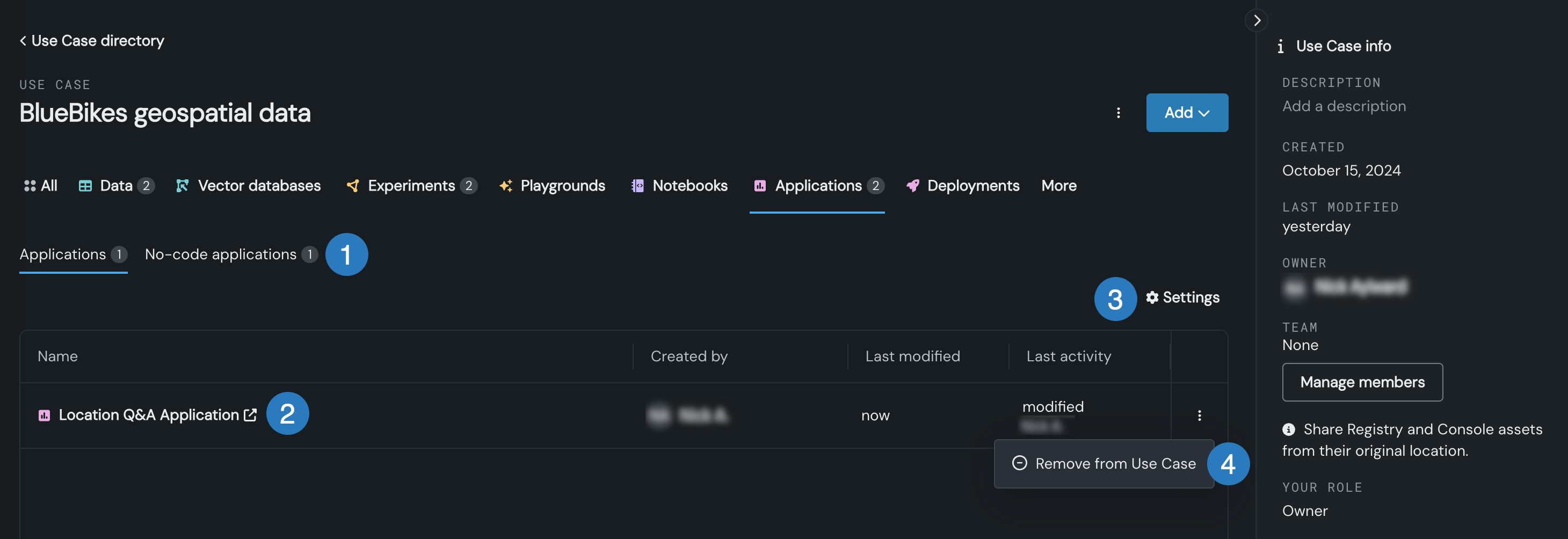 | 4 | アクションメニュー | クリックして、ユースケースからカスタムアプリケーションを削除します。 |