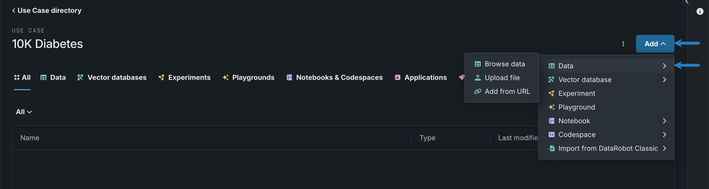 どのタブからでも、追加の右側にある矢印をクリックして、ユースケースにデータを追加できます。 次に、データを選択し、インポート方法を選択します。