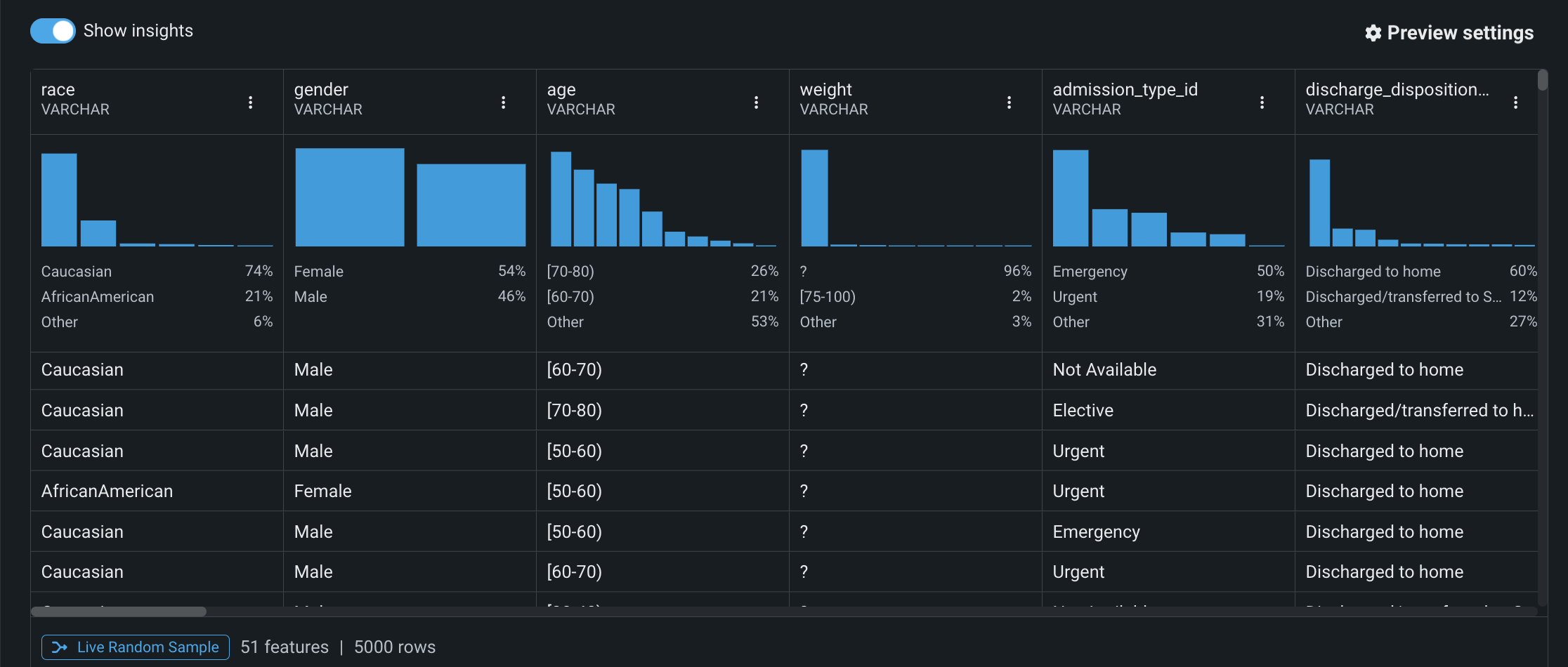 データのラングリング中、DataRobotはライブサンプルに対して探索的データ解析を実行して、表レベルおよび列レベルの サマリー統計と 視覚化を生成します。これは、データセットのプロファイリングや、操作を適用する際のデータ品質の問題の認識に役立ちます。 ライブサンプルの操作の詳細は、 探索的データインサイトのセクションを参照してください。