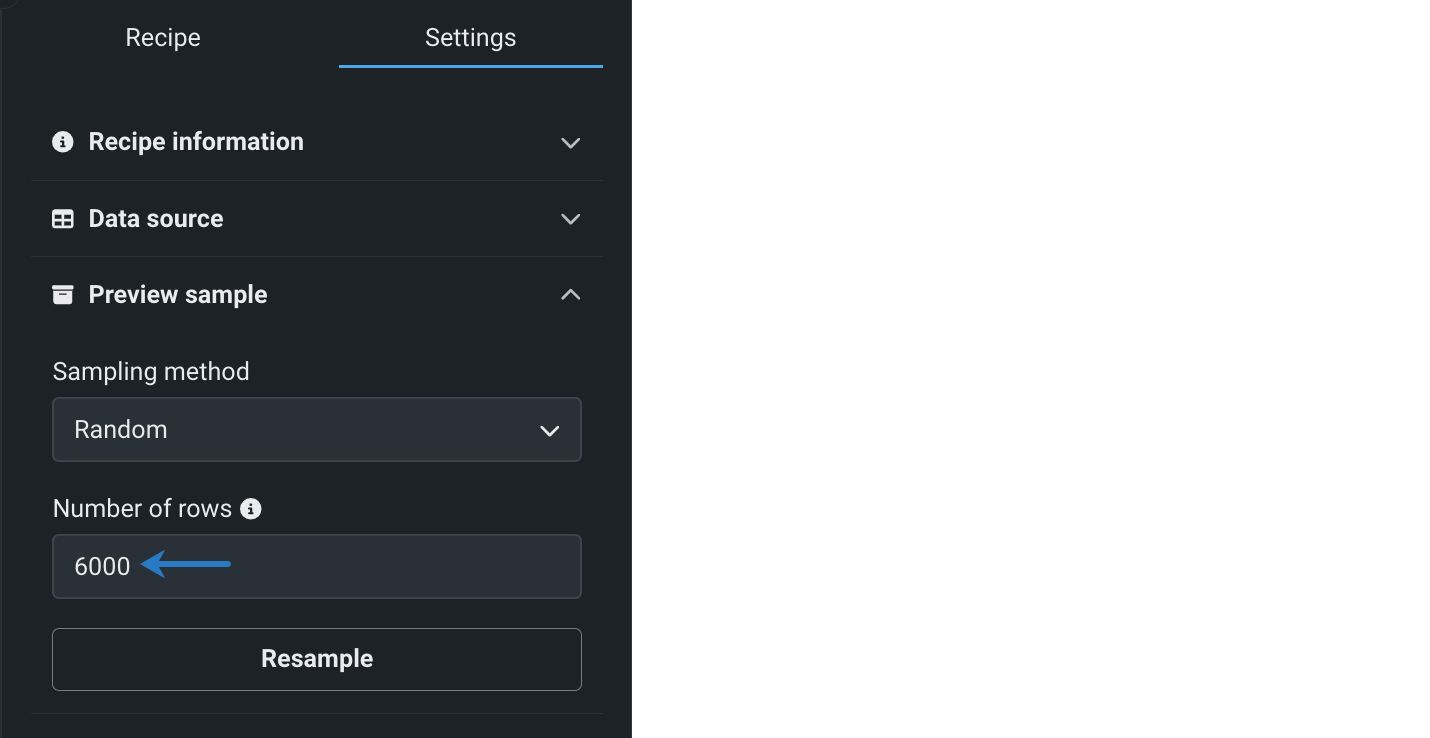 レシピでは、設定を変更して、後で使用できるようにサマリー情報をよりわかりやすくしたり、ライブプレビューに含まれる行数を変更したりできます。