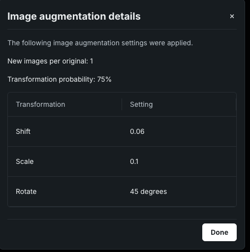 値を設定した後、新しい画像のサンプルをプレビューして値を微調整できます。 プレビューでは、データセットのすべての画像が、すべての可能な変換を伴って表示されるわけではありません。 代わりに、トレーニングに使用されたデータに表示される変換の例とともに、元の画像が表示されます。