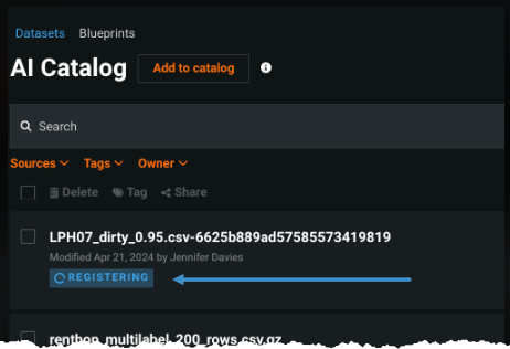 ユースケース内から、 静的、スナップショット、または10GBを超える 動的データセットを追加して、データセットが登録されるのを待ちます。 これは、非増分学習(IL)エクスペリメントよりも大幅に長い時間がかかる場合があります。 登録状況は AIカタログで確認できます。