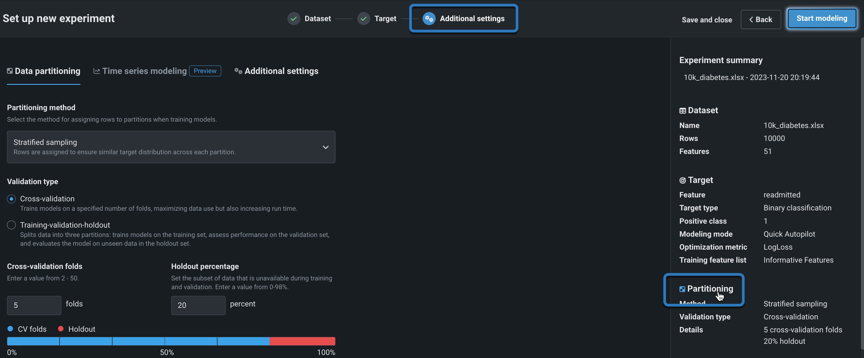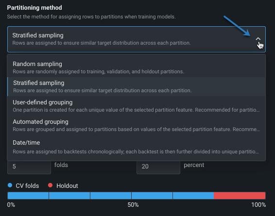 パーティショニングは、評価とモデル構築のためにDataRobotが観測値(または行)をまとめて「集中させる」方法を示します。 ワークベンチのデフォルトは、 層化サンプリング(二値分類エクスペリメントの場合)またはランダム(連続値エクスペリメントの場合)による 5分割交差検定、および20%のホールドアウト分割です。