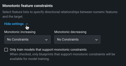 単調制約特徴量を使用するには、 特殊な特徴量セットを作成する必要があります。この特徴量セットは、ここで選択されます。 また、手動モードを使用する場合、使用可能なブループリントにはMONOバッジが付けられ、サポートされるモデルを識別できます。